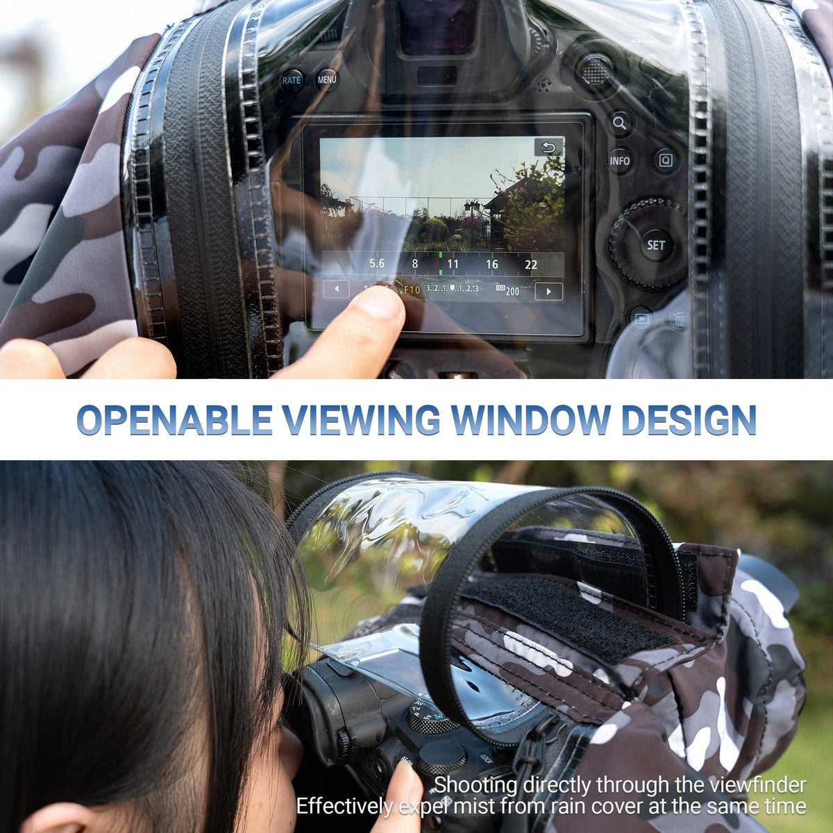 Q: Can I use the JJC Camera Rain Cover while taking photos?A: Yes, the design allows for easy access to your camera's controls through the oversized clear viewing window and cinchable sleeves. You can also secure a camera strap through the rain cover's opening for handheld shooting.