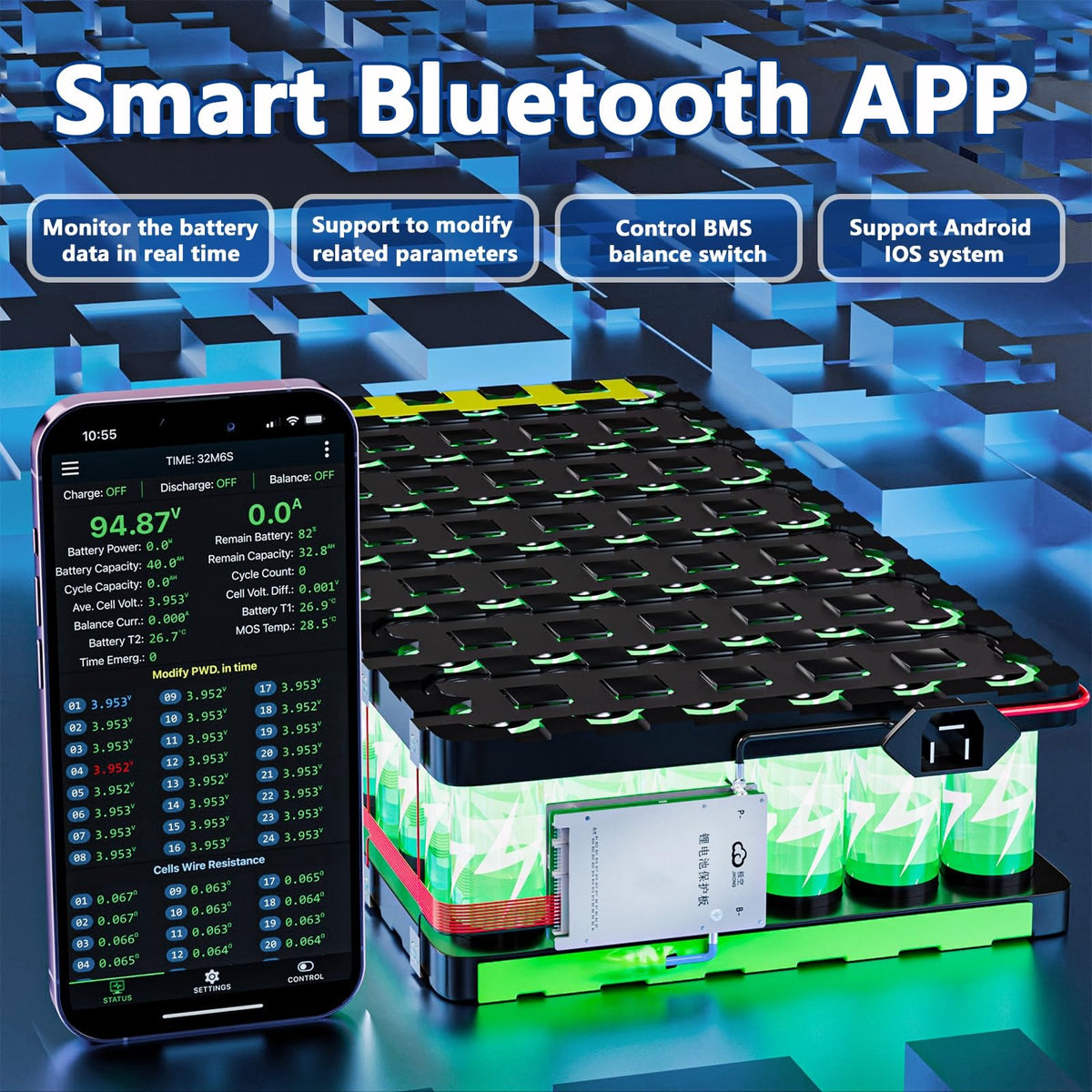 Q: Can I monitor the battery status using a mobile app?A: Yes, the JKBMS Smart BMS includes Bluetooth connectivity that allows users to monitor battery status, adjust settings, and control charging and discharging via the JK BMS mobile app available for both Android and iOS.