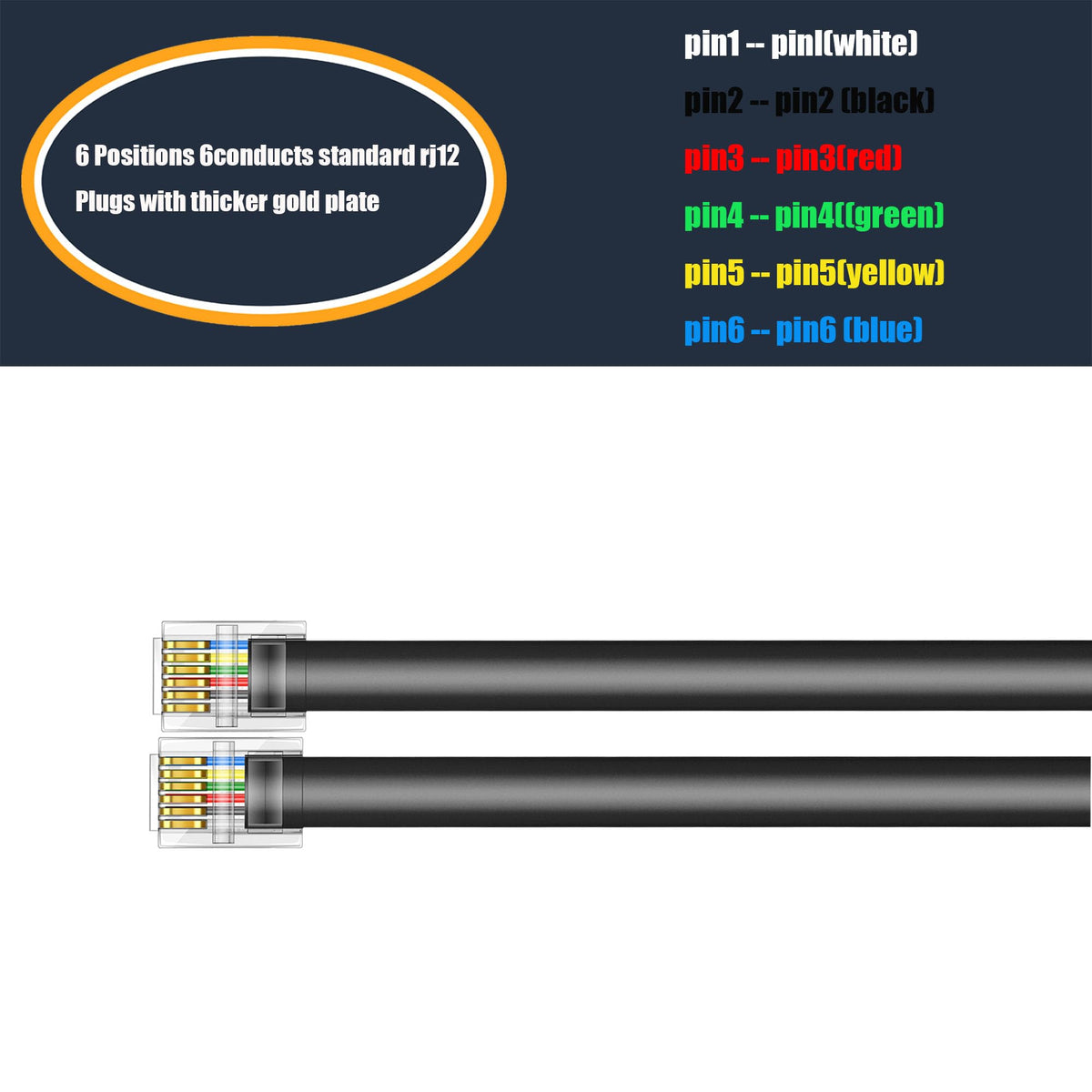 Product Description: This Is A Short Rj12 Data Cable ( Also Called Rj11 6P6C Cable ) For Both Data And Voice Use, With A 6P6C Modular Connector Each End, Product Description:If You Have Any Other Purposes Buying This, Please Make Sure That You'Re Clear About Its Wiring Diagram: 1-2-3-4-5-6 Pin To 1-2-3-4-5-6 Pin Our 6 Conductor Rj12 Telephone Line Cable Is Designed For Use With Both Business And Home Telephone Systems. These Heavy Duty Cables Will Work With 1, 2 Or 3 Line Phones. Plug And Play Ready For Fax Lines, Modems, Cordless Or Standard Phones. Pin1 -- Pin1(White) Pin2 -- Pin2 (Black) Pin3 -- Pin3 (Red) Pin4 -- Pin4 (Green) Pin5 -- Pin5 (Yellow) Pin6 -- Pin6 (Blue) Material: Copper Wires Jacket Material: Pvc, Black/White/Silver Cable Length: 6.6/10/15Feet Easy To Install And Reliable Connection 3 Pcs In The Package Attention: Warranty:Offers 30 Days Money-Back And 1 Year Replacement Service