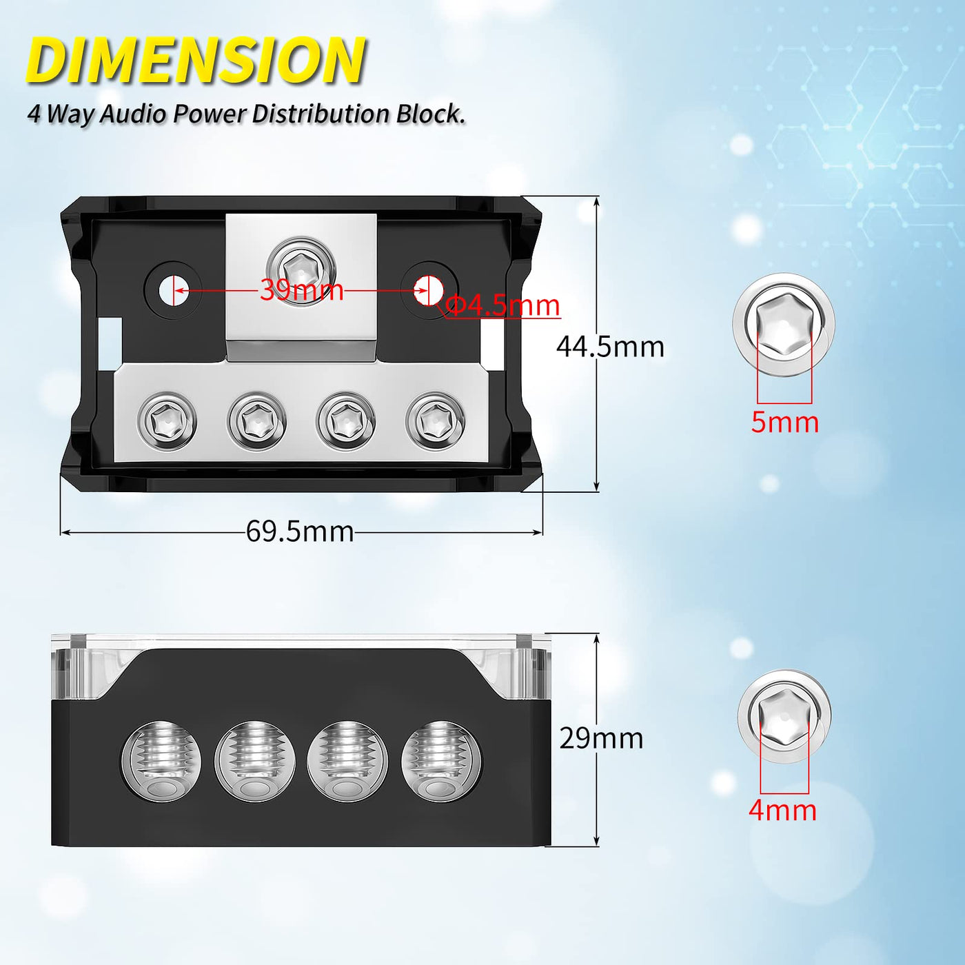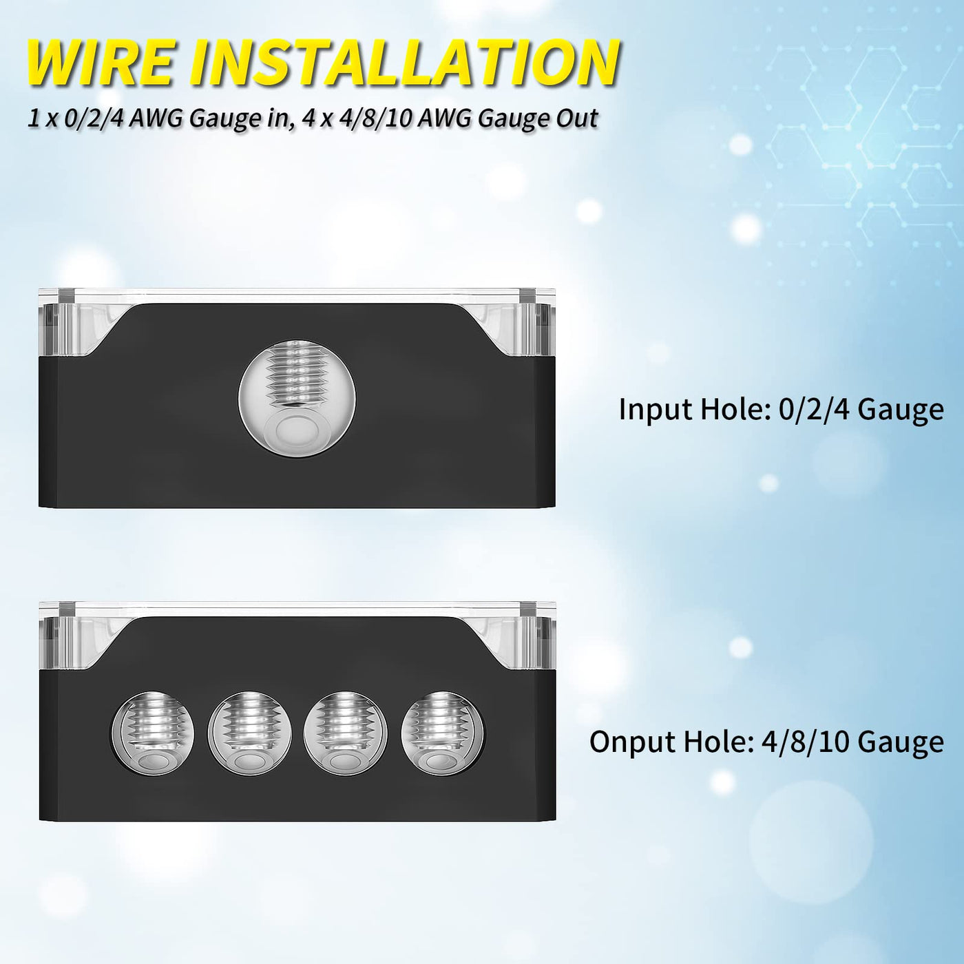 Product: 4 Way Ground Distribution Block, Car Audio Power Distribution Block Splitter. Specification: The Amp Distribution Block Includes: 1 X Input Hole (Allow 0/2/4 Gauge In), 4 X Output Hole (Allow 4/8/10 Gauge Out). Cover: The Power Distribution Block Car Audio Will Come With A Cover, Which Can Shelter The Exposed Contact, Prevent Dust And Accidental Contact After Installing. Easy To Use: The Car Audio Distribution Block Is Simple Build And Easy To Use, Requires No Wiring Lugs When Install. Application: The 4 Way Audio Power Distribution Block Is Suitable For The Amplifier, Audio System Of Automotive, Car, Truck, Marine, Boat, Etc.