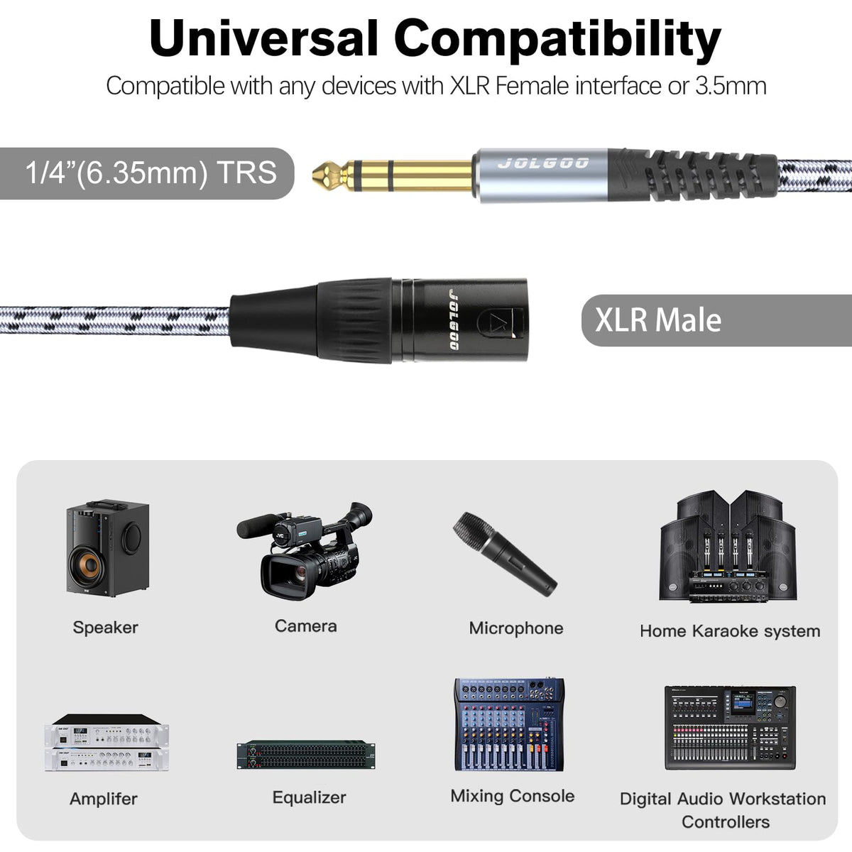 Q: What is the purpose of the JOLGOO 1/4 Inch TRS to XLR Male Adapter Cable?A: The JOLGOO 1/4 Inch TRS to XLR Male Adapter Cable is designed to connect audio equipment with a 1/4 inch TRS output to devices that accept a 3-pin XLR input, such as microphones, mixers, amplifiers, and soundboxes, ensuring high-quality sound transmission.