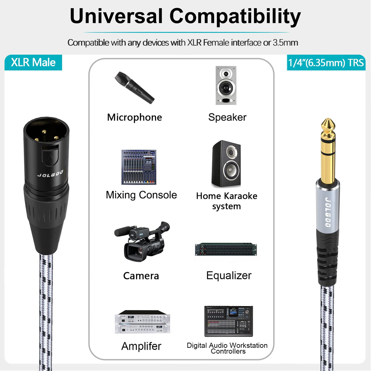 Jolgoo 1/4 Inch Trs To Xlr Male Cable, Balanced 6.35Mm Trs Plug To 3-Pin Xlr Male, Quarter Inch Trs Male To Xlr Male Microphone Cable. Workes Great And Is Exactly What You Needed. Will Make Your Music Sound Very Clear And Powerful. Specifications: Gender : Male-Male Connector A : Xlr Male Connector B : 6.35Mm (1/4 Inch) Trs Stereo Audio Plug Male Cable Conductors : Bare Copper Connector Contacts : Gold-Plated Jacket Material : Nylon Braided + Pvc Cable Gauge : 20 Awg Cable Body Outside Diameter : 6.0Mm / 0.24 Inch Length : 1M / 3.3 Feet Package Contents: 1 X Jolgoo Balanced 1/4 Inch Trs To Xlr Male Cable 3.3 Feet 1 X Cable Tie