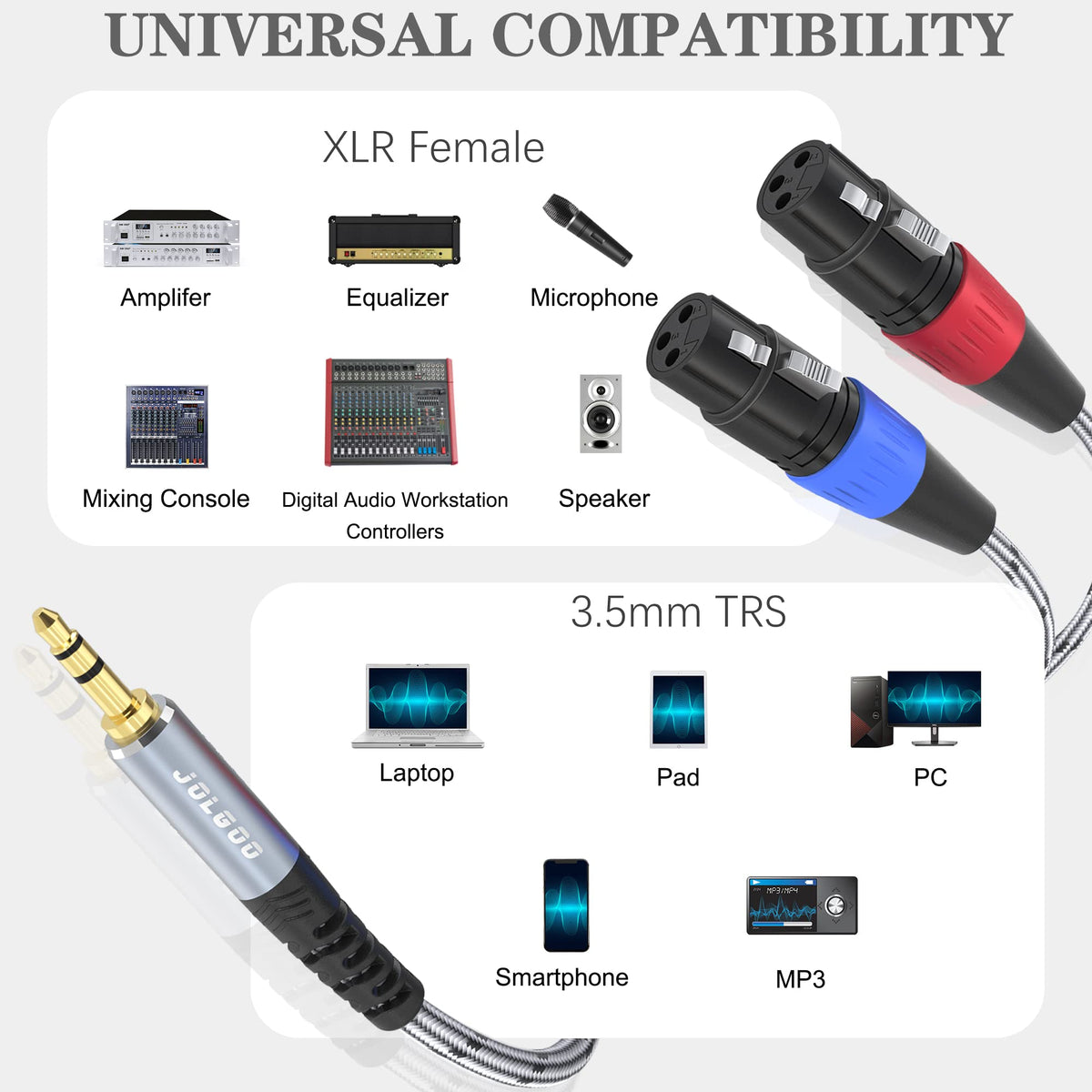 Jolgoo Dual Xlr Female To 3.5 Mm Trs Stereo Microphone Cable, 2 Xlr Female To 1/8 Inch Trs Stereo Y Splitter Patch Cable, 15 Fee