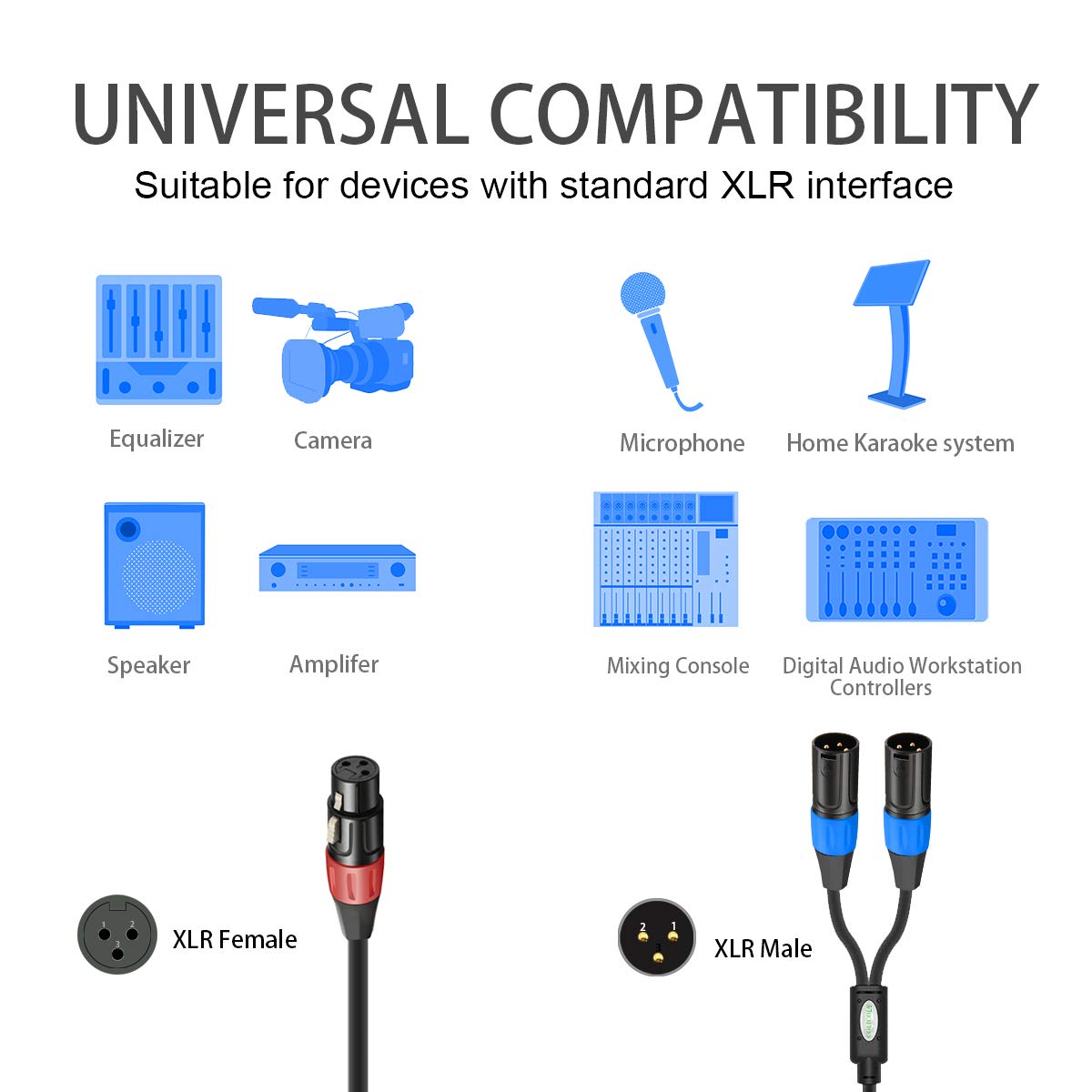 Q: Is the JOMLEY XLR Splitter Cable compatible with all XLR devices?A: Yes, the JOMLEY XLR Splitter Cable is compatible with any XLR connection, including microphones, A/V electronic equipment, mixers, home theater devices, camcorders, and speakers.
