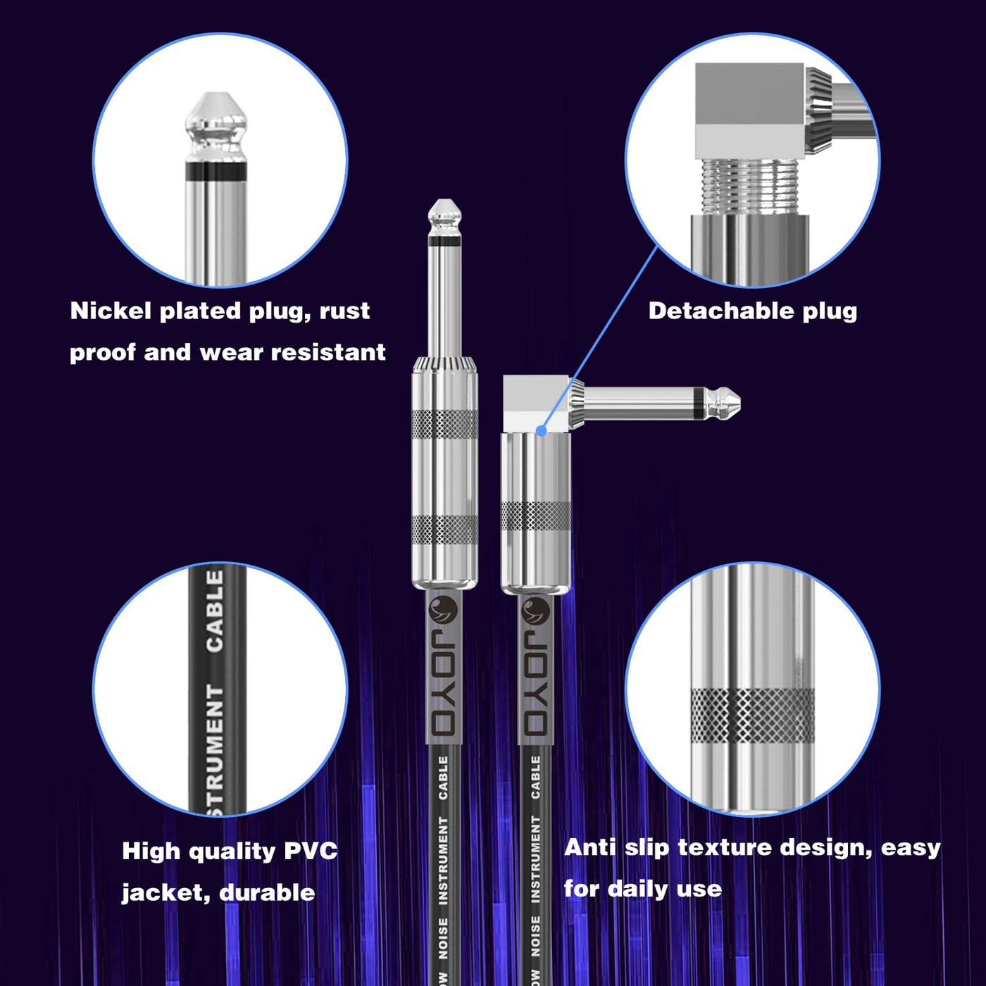 Q: Is the cable durable and resistant to wear?A: Yes, the JOYO Bass Guitar Cable features a high-quality PVC jacket that is both wear-resistant and easy to clean, along with a rubber protective shell at the bend of the plug to prevent damage from bending.