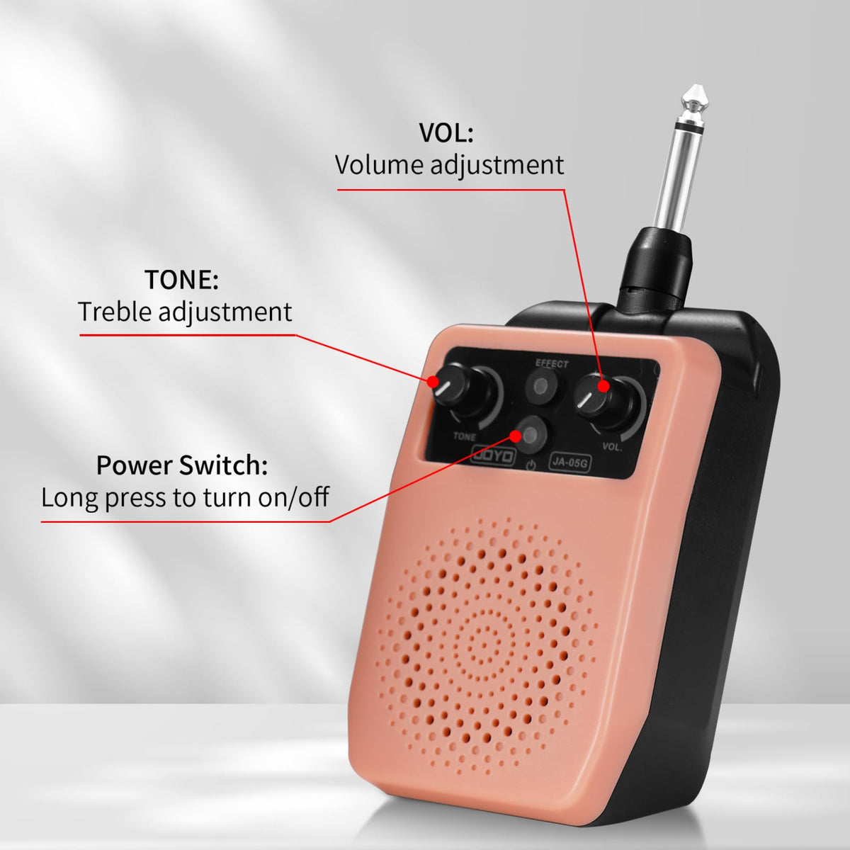 Ja-05G Is A Plug And Play Electric Guitar Amp. It Fits For Electric Guitars With 6.35Mm Jack, With 4 Built-In Effects: Clean, Overdrive,Distortion And Reverb. You Can Enjoy The Backing Tracks Via Bluetooth. Moreover, It Has Tone Control Knob, You Can Adjust It To Increase Or Reduce The Treble Accordingly. Its Lightweight, Portable And Easy To Use, You Can Literally Use It Anytime, Anywhere. Parameters Power: Dc 5V,1A Type-C (Built-In 3.7V/1500Mah Lithium Battery) Output Power: 5W Input Impedance: 470K Speaker Impedance: 4O Weight: 141G Dimensions: 60(L)X42(W)X 105(H)Mm Packing List Ja-05G Mini Electric Guitar Amplifier X1 Owner'S Manual X1 Charging Cable X1