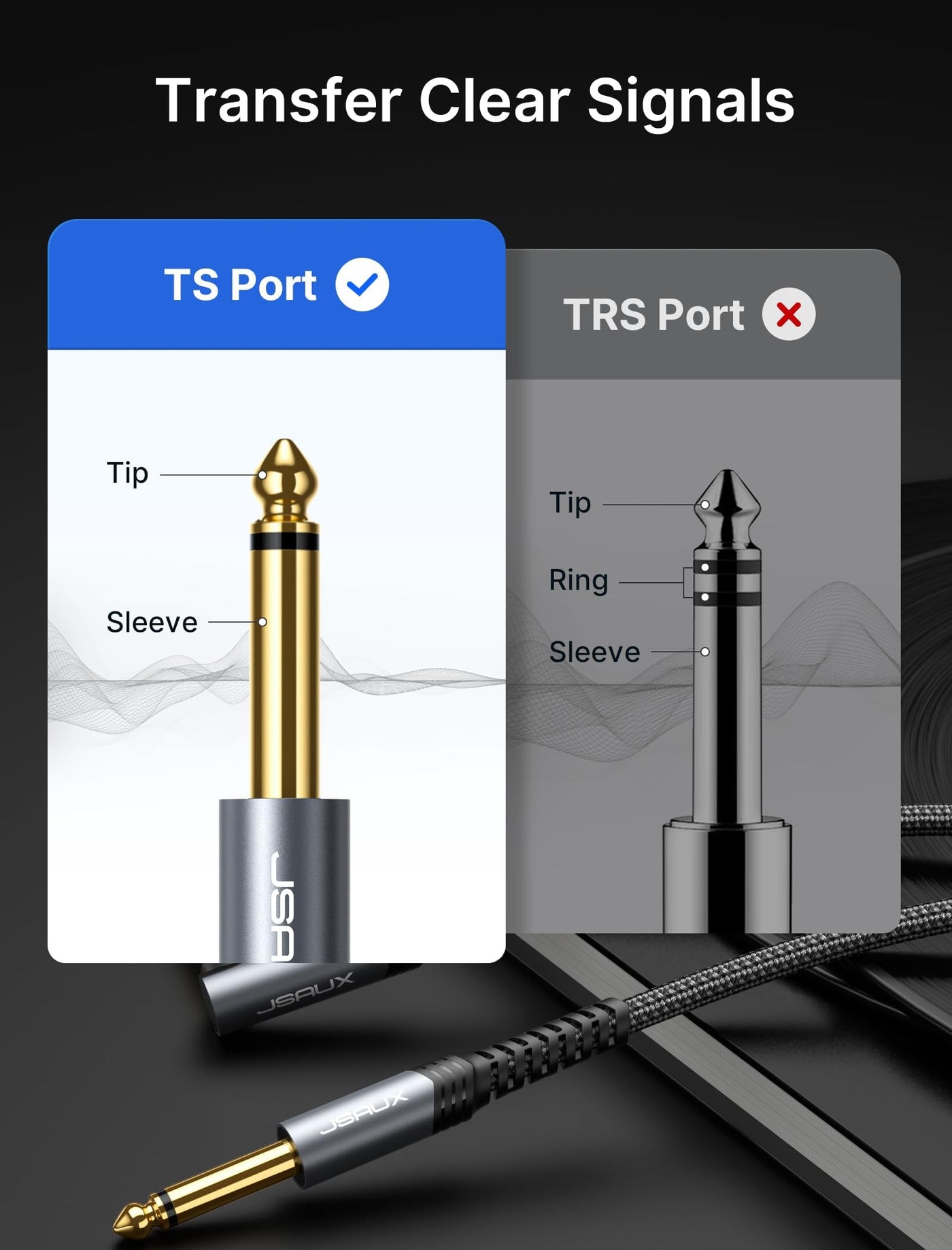 Q: What is the difference between TS and TRS cables, and which should I use?A: TS cables, like the JSAUX guitar cable, are unbalanced audio cables that are ideal for connecting instruments like guitars and basses. TRS cables are balanced and may not provide optimal performance in these situations. For best results, use the JSAUX TS cable for your guitar or bass.
