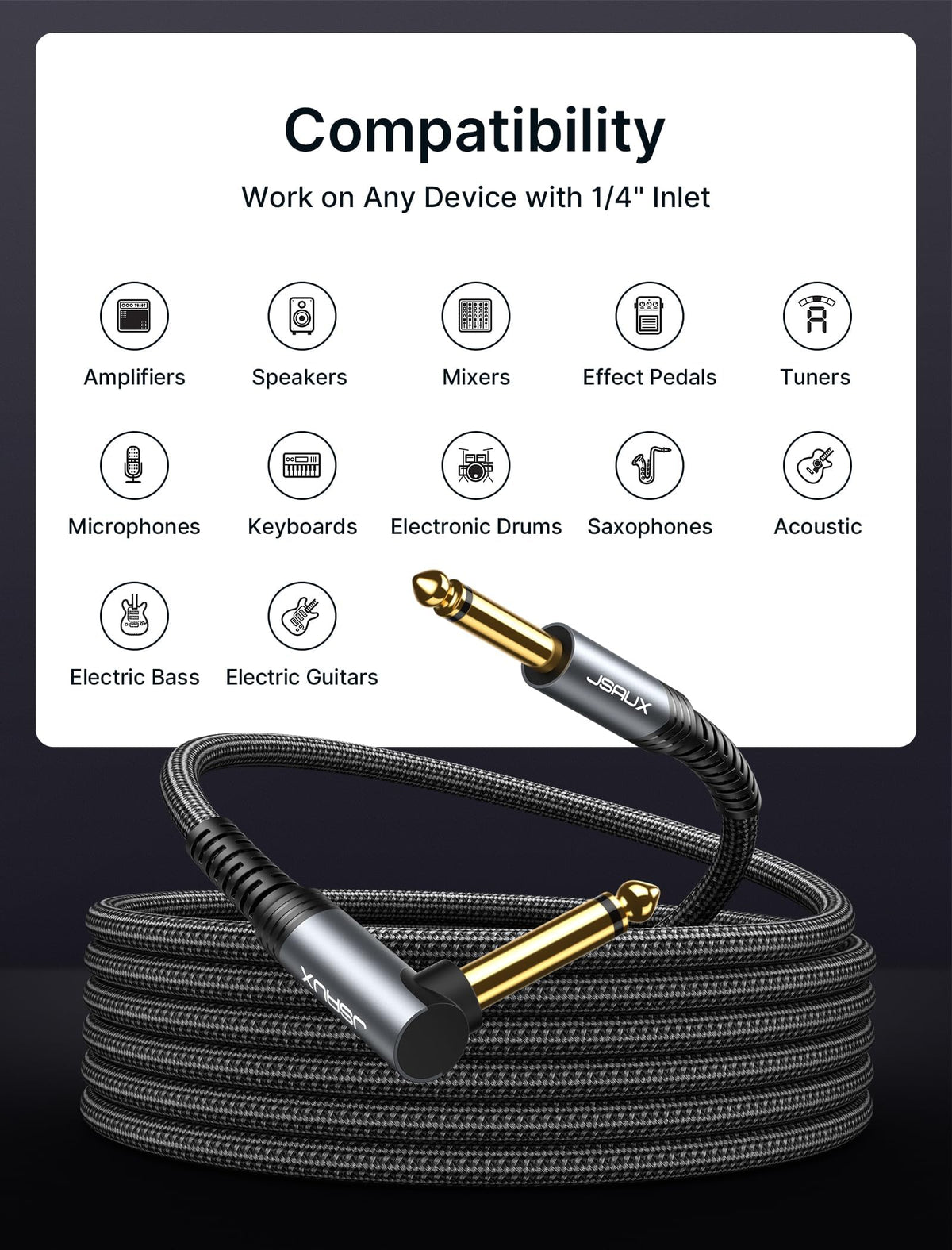 Q: What types of instruments can I use the JSAUX 1/4 Inch Guitar Cable with?A: The JSAUX 1/4 Inch Guitar Cable is highly versatile and compatible with various instruments, including electric guitars, bass guitars, electronic drums, effect pedals, amplifiers, mixers, tuners, microphones, keyboards, and even saxophones.