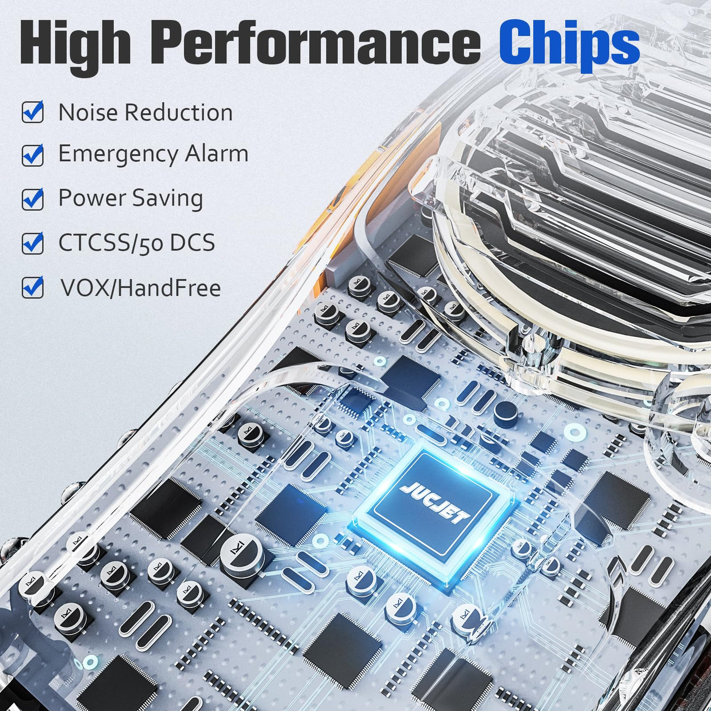 Q: What features do the JUCJET H888S walkie talkies offer?A: The JUCJET H888S walkie talkies include features like VOX voice control, low battery alarm, a built-in LED flashlight, and 16 preset channels for easy communication.