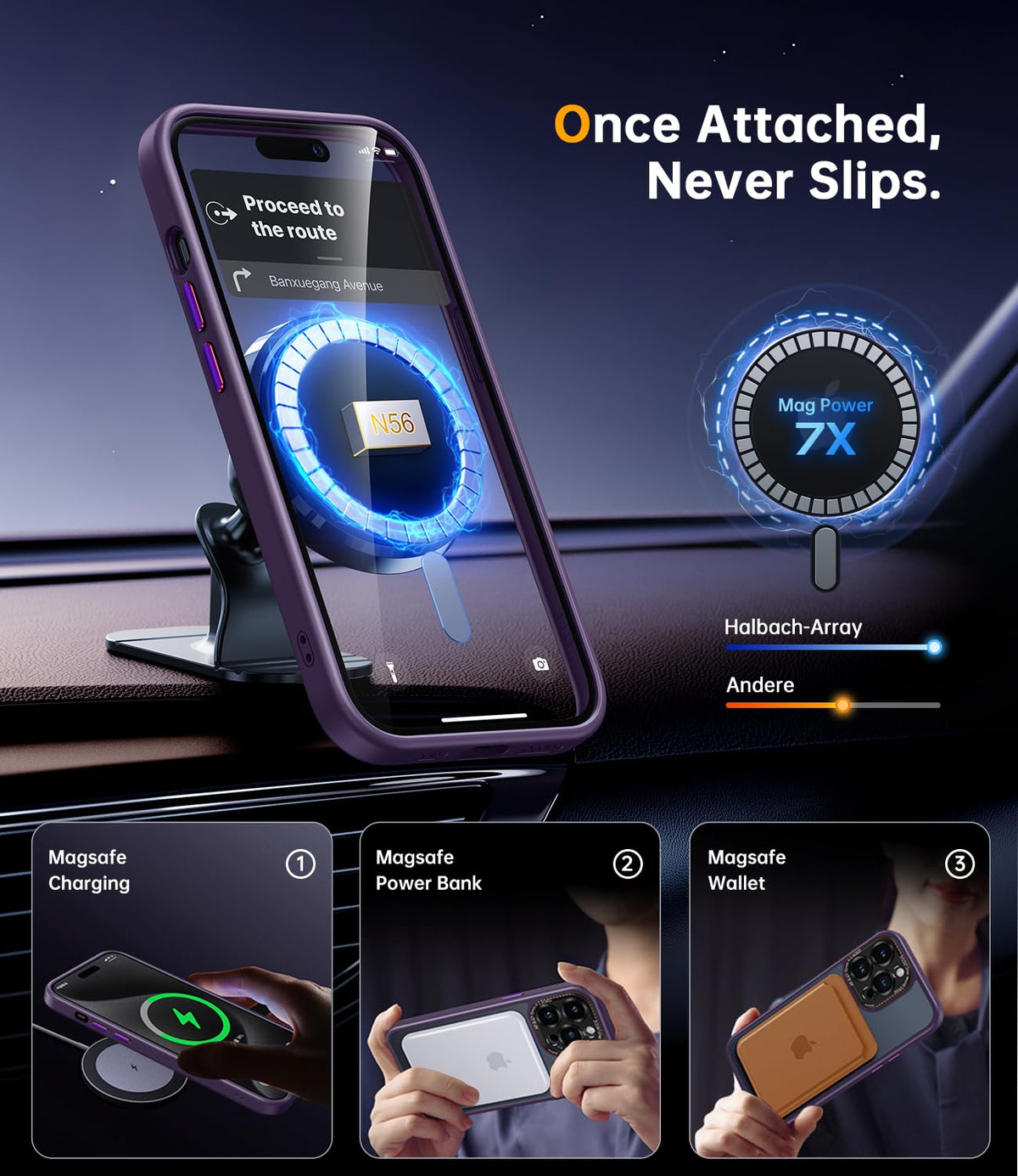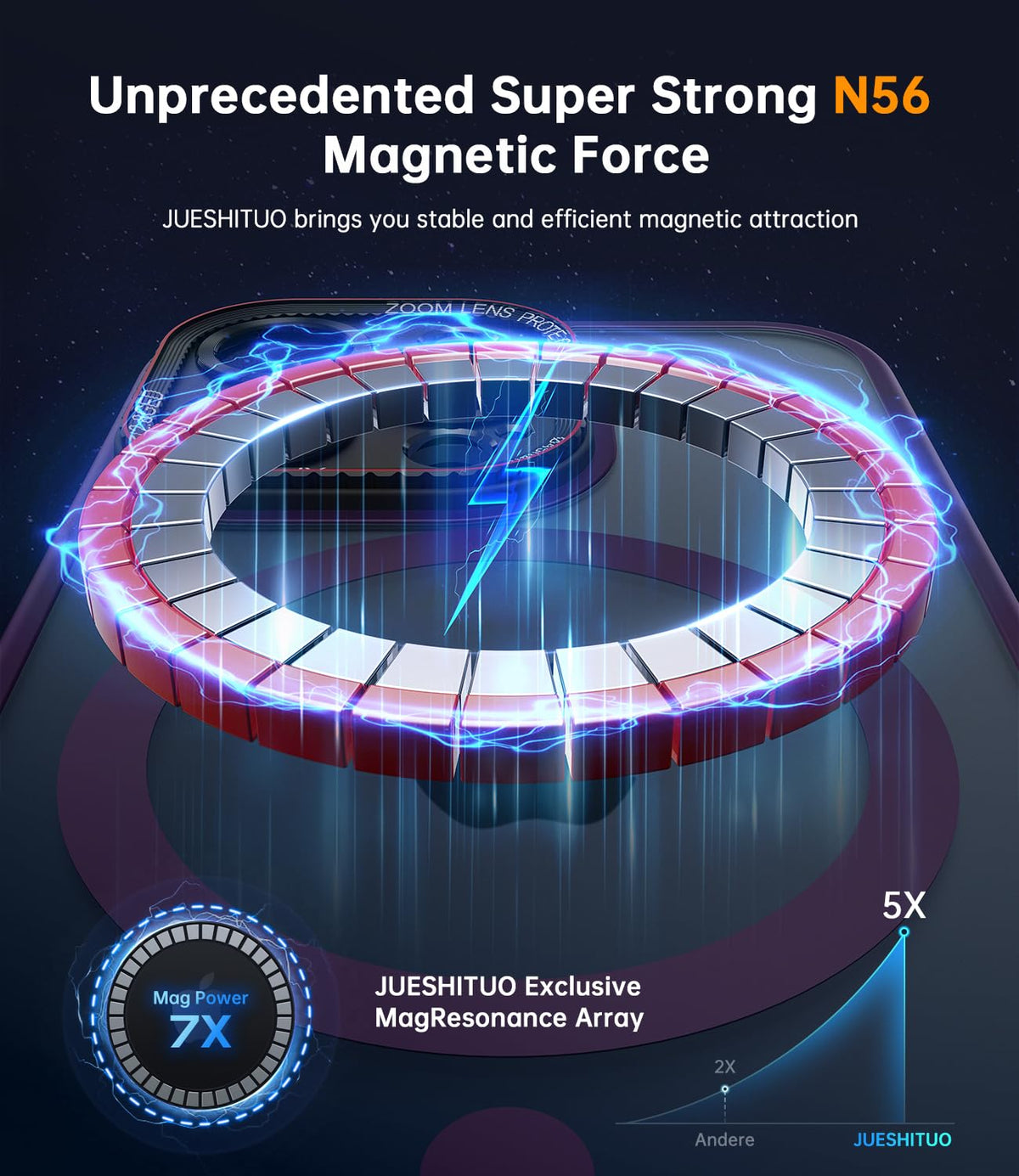 Q: Is the JUESHITUO case compatible with MagSafe accessories?A: Yes, the JUESHITUO case for iPhone 14 Pro Max is designed to be fully compatible with MagSafe accessories, featuring a built-in magnet ring structure that enhances magnetism for secure attachment and efficient wireless charging.