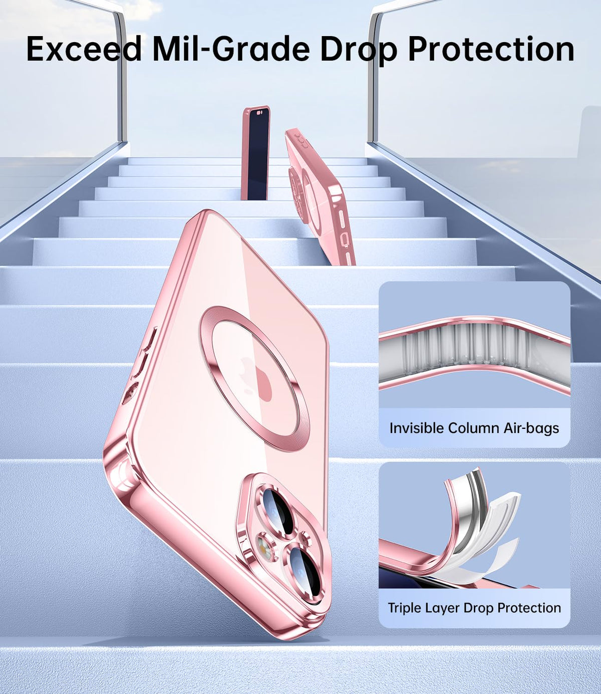 Q: What kind of drop protection does this case offer?A: This case offers military-grade drop protection certified by SGS&ROHS, featuring advanced shock-absorbing airbags that help withstand impacts and drops.