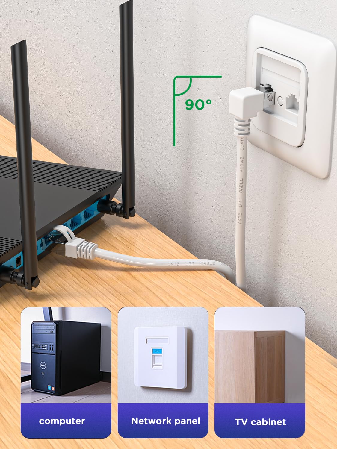 Q: What are the benefits of using a 90-degree Ethernet cable?A: A 90-degree Ethernet cable, like the JUXINICE CAT6, allows for a tighter fit against walls and furniture, preventing bends that can degrade performance. This design helps maintain a stable network connection and can be particularly useful in tight spaces.