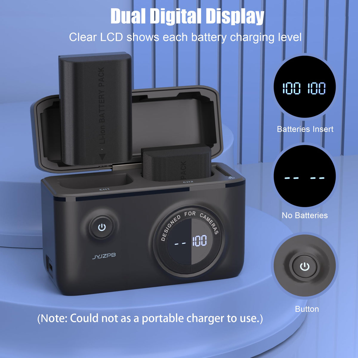 Q: Is the JYJZPB battery charger portable?A: While the JYJZPB battery charger is designed with a compact size and includes a lanyard for easy carrying, it cannot be used as a portable charger, as it requires a Type-C cable to recharge the batteries.