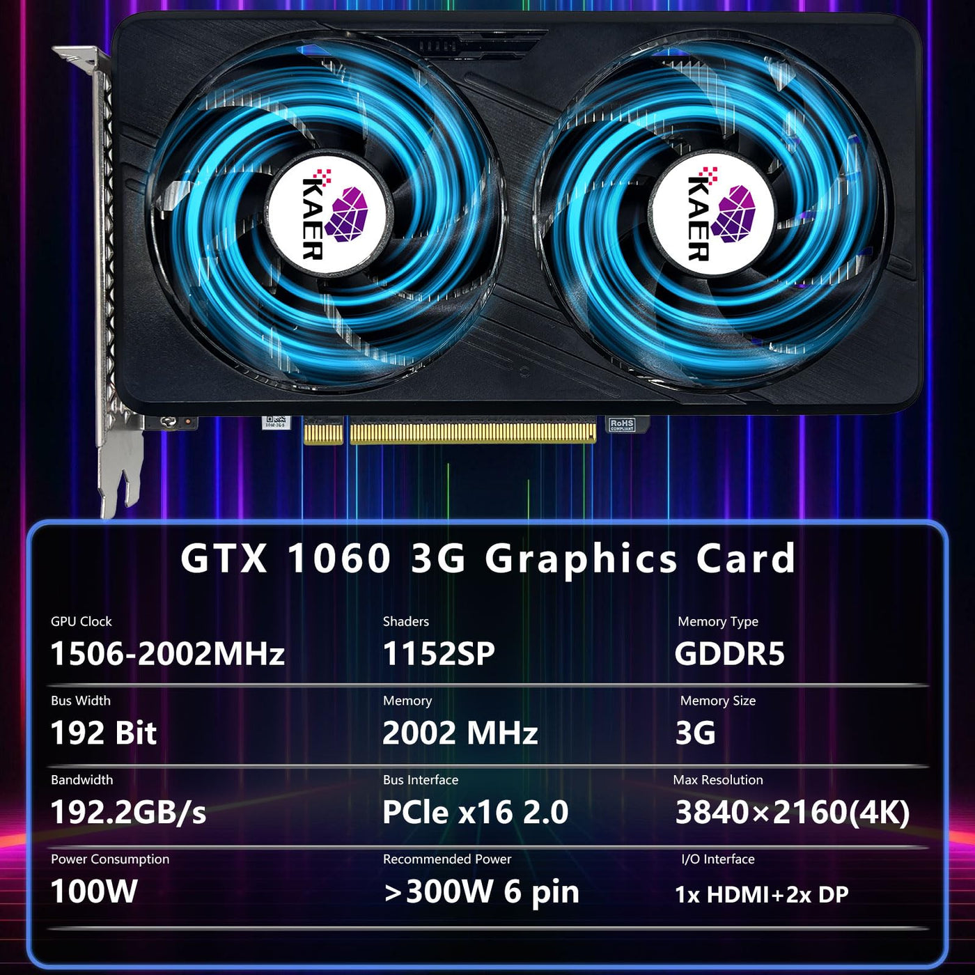 This Graphics Card From Kaer Is A Powerful Option For Gamers Looking To Play Modern Titles At High Settings. The Nvidia Geforce Gtx 1060 Features 3Gb Of Gddr5 Memory And A 192-Bit Interface, Delivering Smooth Frame Rates At 1080P Resolutions. With Its Dual Cooling Fans, The Card Maintains Stable Temperatures Even During Intensive Gameplay. Port Options Include Hdmi And Displayport, Allowing Compatibility With A Wide Range Of Desktop Monitors And Tvs. While Not The Highest-End Model, The Gtx 1060 Delivers Strong Performance At A Reasonable Price Point. Its Versatile Connectivity And Quiet Cooling Make It A Smart Choice For Mainstream Gaming Pcs.