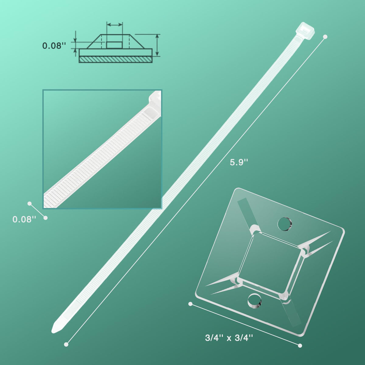 Q: What size are the cable ties and adhesive mounts included in the package?A: The package includes 120 clear nylon zip ties that measure 5.9 inches in length and 0.1 inches in width, as well as 120 adhesive mounts that measure 3/4 inch by 3/4 inch (19mm x 19mm). This combination provides a comprehensive solution for cable management.