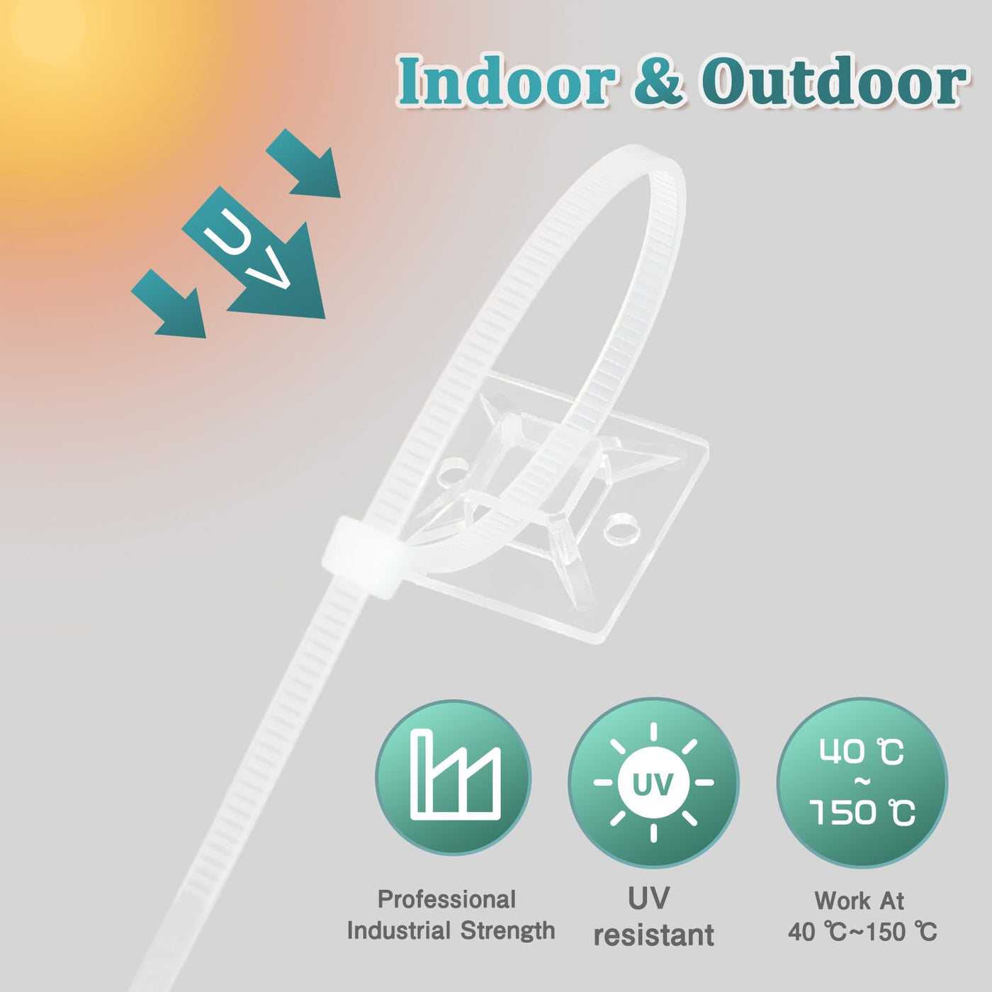 Q: How strong are the adhesive mounts for the cable ties?A: The adhesive mounts are made from professional industrial strength nylon and feature a strong adhesive that ensures a firm grip on clean, flat, and dry surfaces. They are designed to withstand temperatures ranging from -40 ℃ to 150 ℃, making them reliable for both indoor and outdoor use.