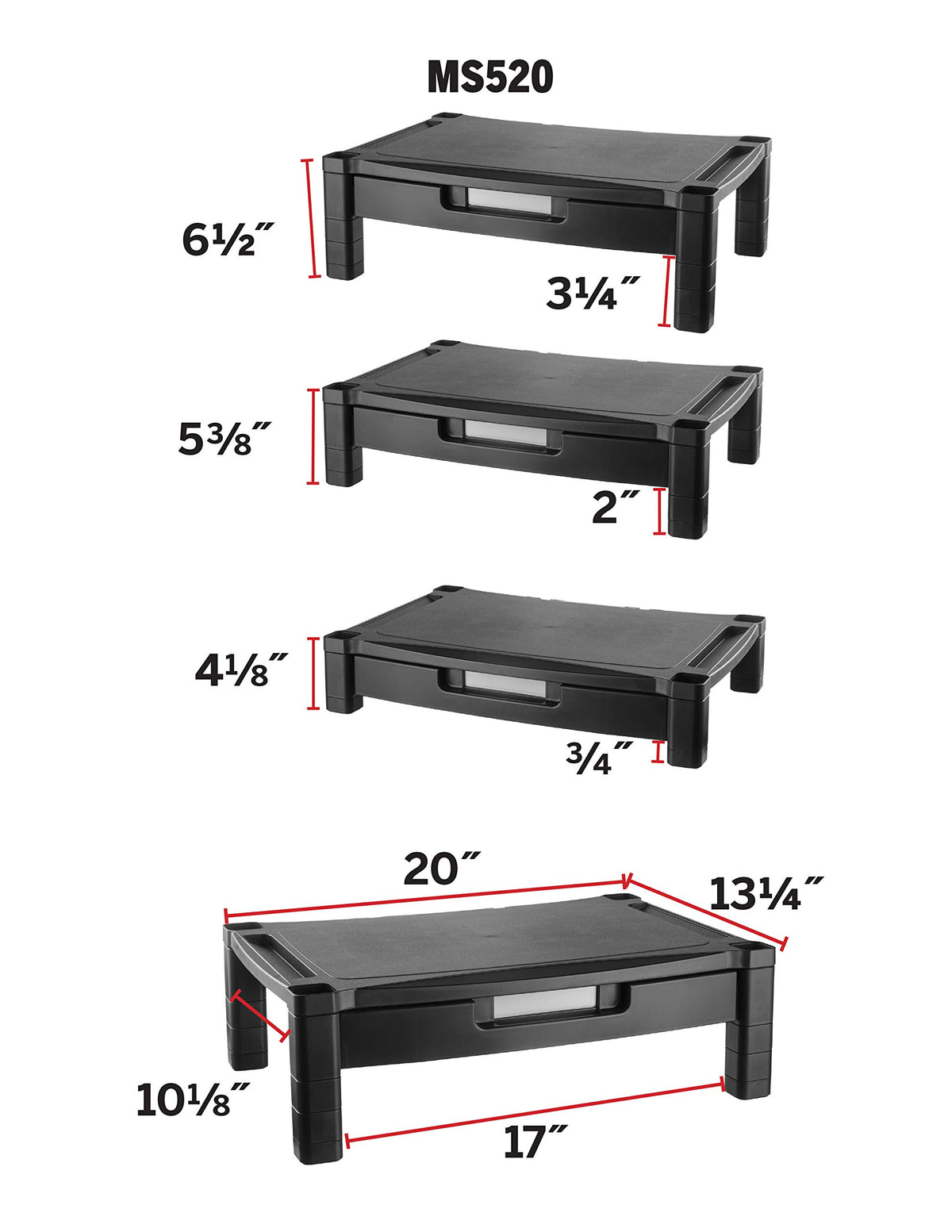 Create A More Efficient Work Space With The Kantek Single Level Extra Wide Adjustable Monitor/Laptop Stand With Drawer. The Extra Large Platform (20 X 13.25 Inches) Accommodates Most Monitors, As Well As Laptops, Fax Machines, And Printers. This Stand Raises Your Monitor Or Laptop To A Comfortable Viewing Level With Height Adjustments From 4.1 To 6.5 Inches, In 1.25 Inch Increments. The Stylish Black Color Coordinates With Any Decor.