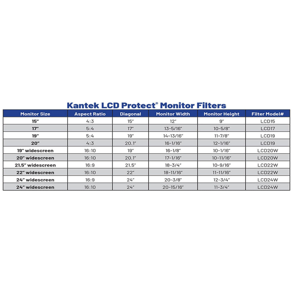 Antireflective Coating Reduces Glare By 95%, Improves Image And Enhances Contrast To Help Prevent Eyestrain And Thereby Reduce Fatigue. (Not Designed To Filter Out High Direct Glare From A Light Source Shining Directly On The Monitor, Such As A Direct Window Or Overhead Lighting). Fully Assembled; Simple Hanging Bracket Mounting; Elegant Frameless Design With Silver Trim. Natural Light Tint For True Color Fidelity. Protects Lcd Display Surface. Fits Both 19 And 20-Inch Standard (Not Widescreen) Lcd Monitors. The Actual Filter Measures 16.2'' W X 13.2'' H, And Fits Over The Front Of The Entire Monitor. (19'' Monitors Have A 19.0'' Viewable Diagonal And The Viewing Area Is 14 13/16'' W X 11 7/8'' H. 20'' Monitors Have A 20.1'' Viewable Diagonal And The Viewing Area Is 16 1/16'' W X 12 1/16'' H). Before Choosing Your Screen, Use Measuring Instructions In Image To Left To Ensure You Choose Appropriately. (Full Measuring Instructions And Chart Of All Available Filter Sizes Available In Technical Specifications Below) About Us: - Founded In 1982 As One Of The First Manufacturers Of Anti-Glare Filters For Personal Computers, Kantek Has Always Been An Industry Pioneer. Focusing On The Needs Of Our Customers, Amid A Rapidly Changing Marketplace, Has Led To Our Continued Growth With An Ever Expanding And Evolving Product Line.