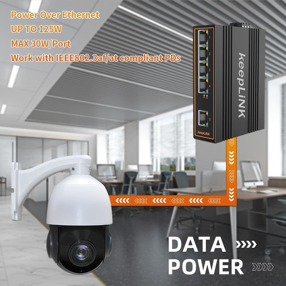 Keeplink 5 Port Industrial Poe Switch Unmanaged, 125W Fast Ethernet Din Rail Switch, Ip40, Operating Temperature Range Of 30