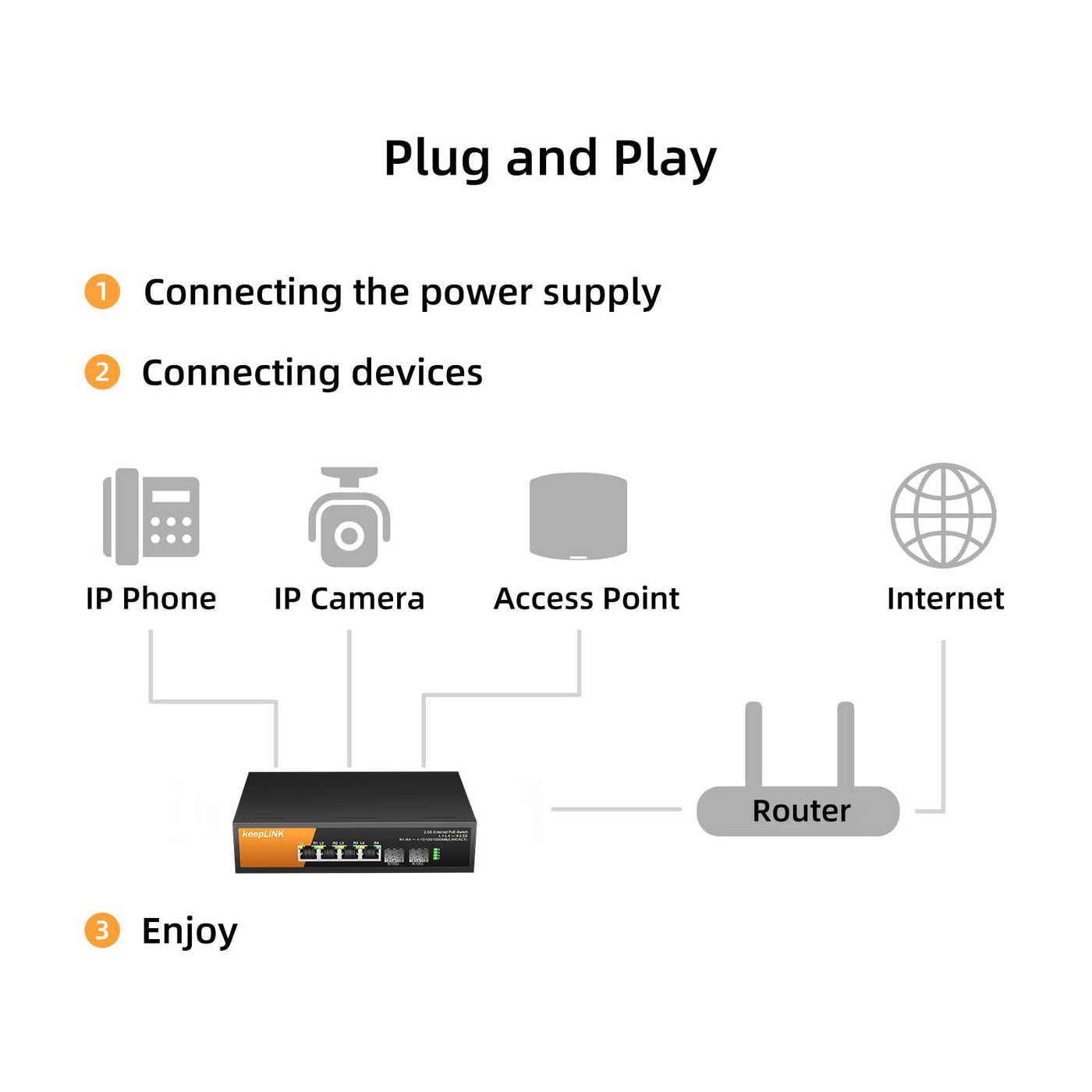Q: How easy is it to set up the keepLiNK 6 Port 2.5G PoE Switch?A: The keepLiNK 6 Port 2.5G PoE Switch is unmanaged, meaning it offers plug-and-play functionality that requires no software or configuration for setup, making it incredibly user-friendly.