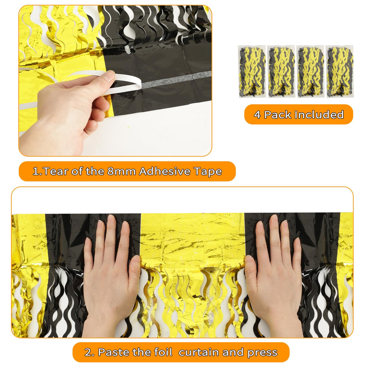 Keeuh 4 Pack Black And Gold Wavy Foil Fringe Curtains Pirthday Decorations,3.3 Ft X 6.6 Ft Metallic Foil Curtains Streamers For