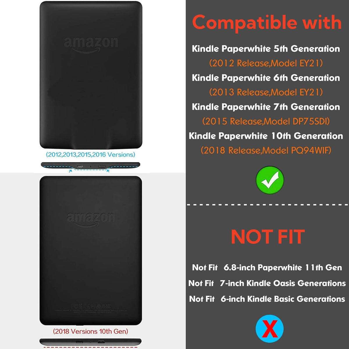 Kerom Kindle Paperwhite Case 6 Inch With Hand Strap And Stand (2012-2018 Versions)Compatibility:Compatible With 6-Inch Kindle Paperwhite 10Th Generation 2018 (Model No. Pq94Wif)Compatible With 6-Inch Kindle Paperwhite 7Th Generation 2015 (Model No. Dp75Sdi)Compatible With 6-Inch Kindle Paperwhite 6Th Generation 2013 (Model No. Ey21)Compatible With 6-Inch Kindle Paperwhite 5Th Generation 2012 (Model No. Ey21)Does Not Fit:Kindle Paperwhite 11Th Gen 2021, Model: M2L3Ek/M2L4Ekkindle 10Th Gen 2019, Model: J9G29Rkindle Oasis 10Th Gen 2019, Model: S8In4Okindle Oasis 9Th Gen 2017, Model: Cw24Wikindle 8Th Gen 2016, Model: Sy69Jlkindle 7Th Gen 2014, Model: Wp63Gwkindle 4Th/5Th Gen 2011/2012, Model: D01100Note: Please Check The Model Number On The Back Of Your Device Before Purchasing!Features:Premium Material: Made Of High-Quality Hard Plastic And Synthetic Leather Material. Protects Your Device From Scratches, Fingerprints, And More.Quality Workmanship: Soft Microfiber Lining And Advanced Texture Provide A Smooth, Comfortable Feel To The Touch.Hand Strap Feature: The Handle Allows For More Comfortable, One-Handed Use, Especially When Lying Down And Reading.Stand Feature: The Folding Stand Makes It Easy To Place Your Kindle On Your Desk, Table, Or Lap While You Read.Auto Sleep/Wake: Automatically Wakes Your Device Or Puts It To Sleep When The Cover Is Opened Or Closed.Magnetic Closure: Strong Magnets Keep The Cover Securely Closed And Prevent Accidental Opening.Slim And Lightweight: It Protects Your Device Without Adding Bulk Or Weight, And Is Easy To Carry And Slip Into A Pocket Or Bag When You Are On The Go.