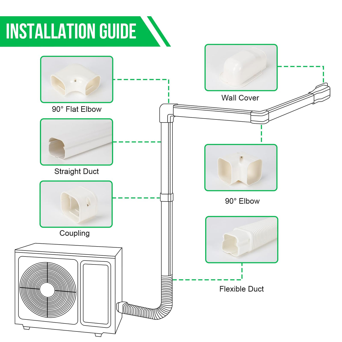 Q: What is included in the Kerykwan Mini Split AC Line Cover Kit?A: The kit includes four straight ducts measuring 4 inches wide and 39.3 inches long, three coupling pieces, two types of 90° flat elbows, a wall cover, and a flexible duct, providing a complete solution for your installation needs.
