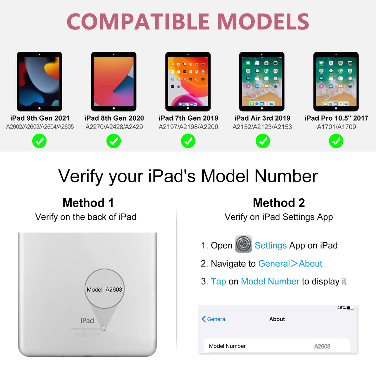 Q: Is this keyboard case compatible with my iPad model?A: Yes, this keyboard case is compatible with the iPad 10.2 inch 9th, 8th, and 7th Generation models, as well as the iPad Air 10.5 inch (3rd Gen) and iPad Pro 10.5 inch. Please verify your iPad's model number before purchasing.