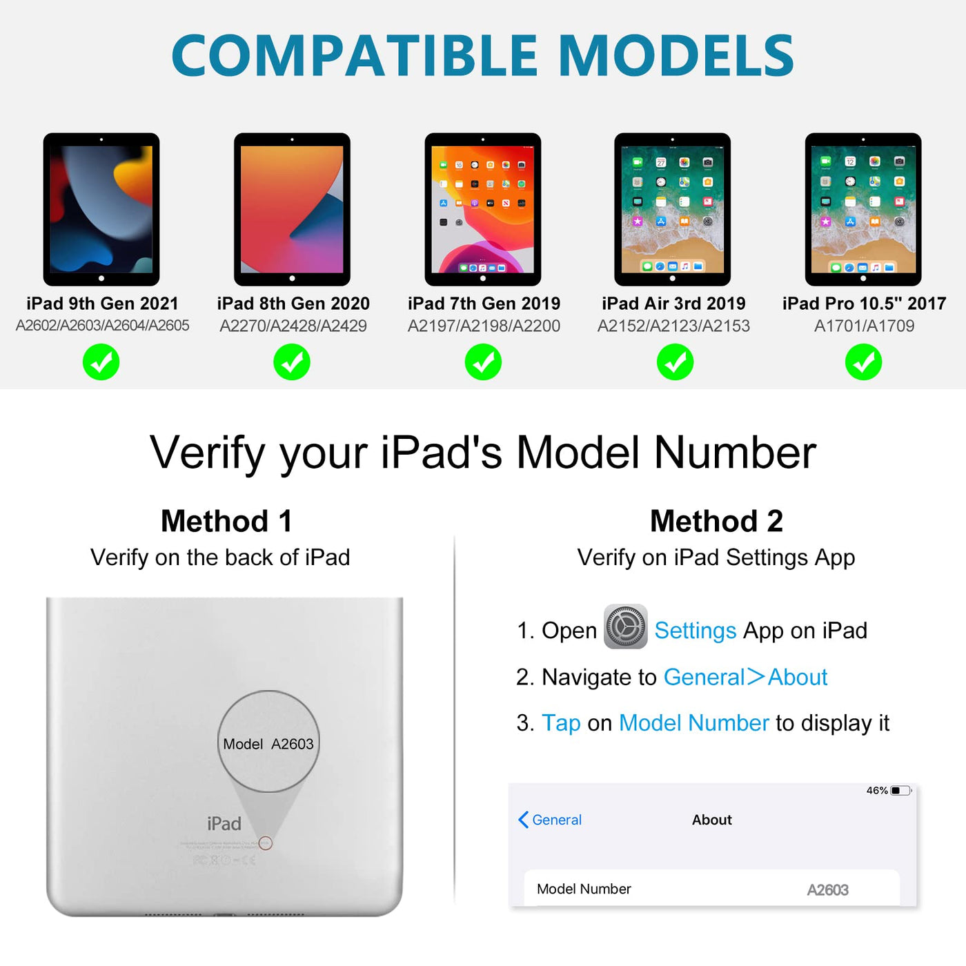 Q: Is this keyboard case compatible with my iPad model?A: Yes, this keyboard case is designed for various iPad models including the 9th, 8th, and 7th Generation 10.2 inch iPads, as well as the iPad Air 10.5 (3rd Gen) and iPad Pro 10.5 inch. Please check your tablet's back model number to ensure compatibility.