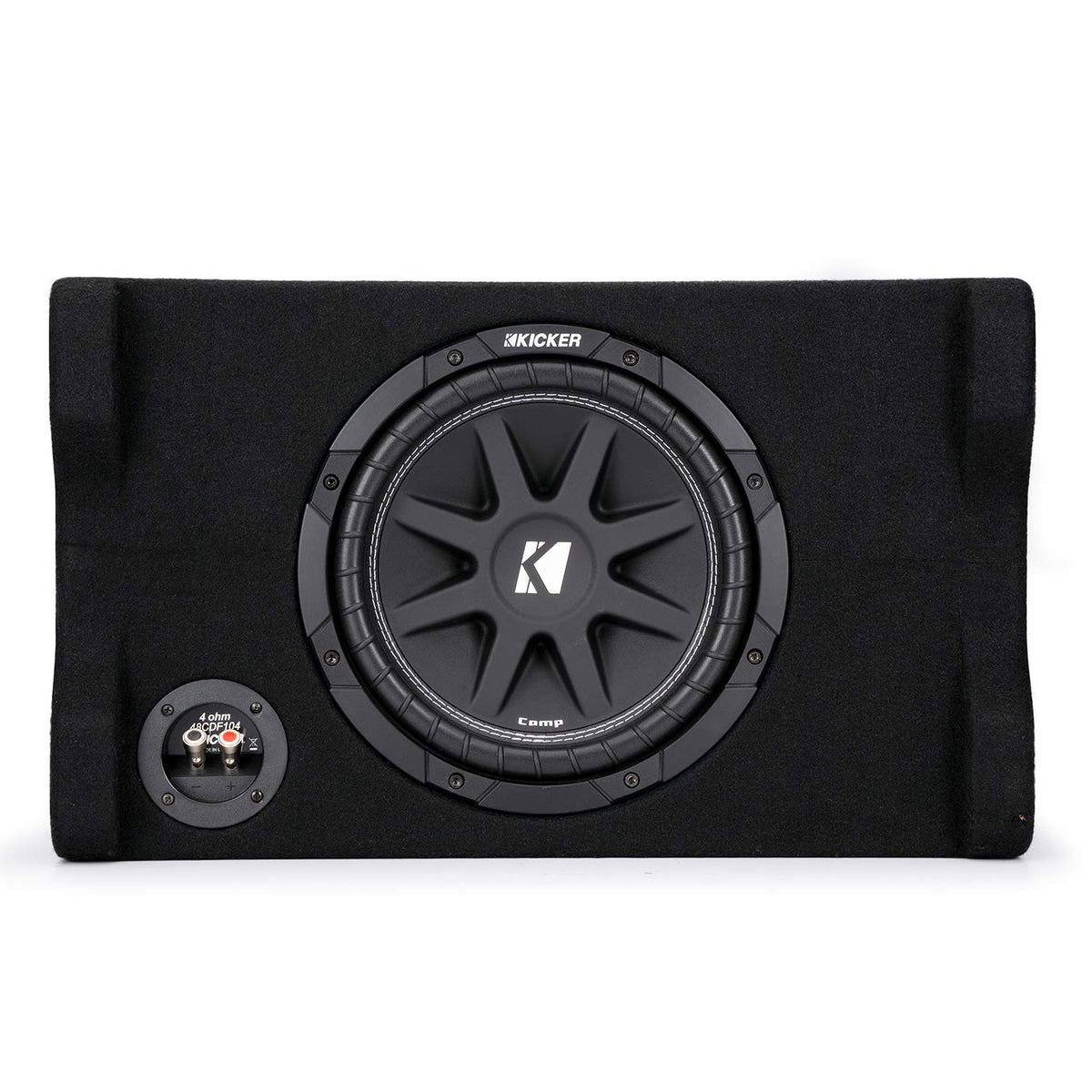 Comp 10'' (25Cm) Subwoofer In Down Firing Enclosure, 4-Ohm Kicker Comp Down-Firing Loaded Enclosures Gives You Affordable Big-Bass Performance - Without Taking Up Lots Of Room In Your Trunk Or Cargo Area. Stack Your Stuff The High-Output Comp Down-Firing Enclosures Are Tough As Nails. Load Your Cargo Right On Top Of The Sub For Extra Space - With Plenty Of Bass! No Grilles Needed. Comp Power With Full Perimeter Venting And Uniplate Back Plate And Pole Piece, The Comp Subwoofer Has Outstanding Thermal Management. A Stiff, Injection-Molded Cone With 360-Degree Back Bracing Keeps The Bass Smooth And Loud All Day Long. Better Boxes Built For Extreme Bass, This Kicker Sub Box Utilizes Extensive Internal Bracing, Thick Mdf Construction And Custom Embroidery. You Get The Kind Of Reliability And Great Looks That Make Showing Off Your Bass Easy - And Awesome! Specifications: Size: 10'' Ohms: 4 Rms Power Handling: 150
