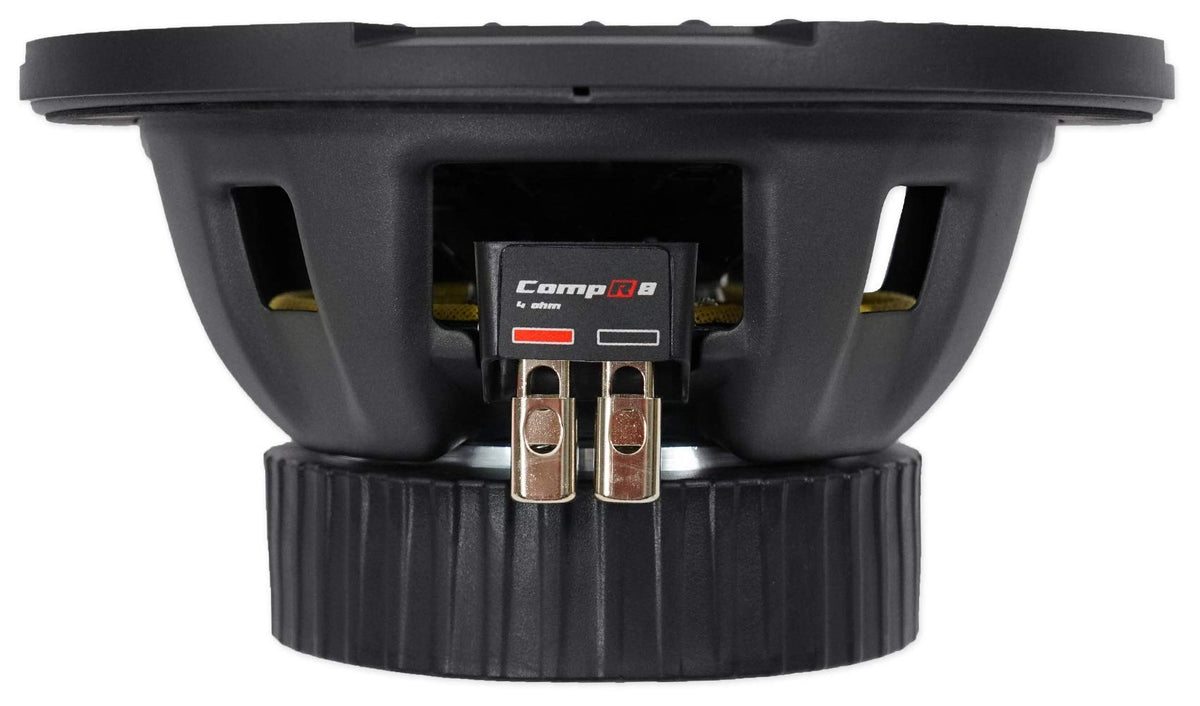 8'' Compr 4 Ohm The Compr Eight-Inch Subwoofer Is A 4O Dual Voice Coil Design, Making It Easy To Get The Most Out Of Your Amp. A Stacked Magnet Structure Reliably Delivers Huge Power Handling And Control, While The Uniplate Back Plate And Pole Piece Serve As One Solid Unit, Providing Excellent Thermal Management. The Compr Eight-Inch Subwoofer Works Best With A Sealed Or Ported Enclosure And 300 Watts Of Recommended Power. See Below For More Details. Specifications Size [In, Cm]: 8, 20 Impedance [Ohms]: 4 Dvc Power Watts [Peak/Rms]: 600/300 Sensitivity [Db 1W/1M]: 82.1 Mounting Depth [In, Cm]: 4-1/8, 10.5 Mounting Diameter [In, Cm]: 7, 17.7 Min Sealed Box Vol [Cu. Ft, L]: 0.4, 11.3 Max Sealed Box Vol [Cu. Ft, L]: 1.0, 28.52 Min Vented Box Vol [Cu. Ft, L]: 0.8, 22.7 Max Vented Box Vol [Cu. Ft, L]: 1.2, 34