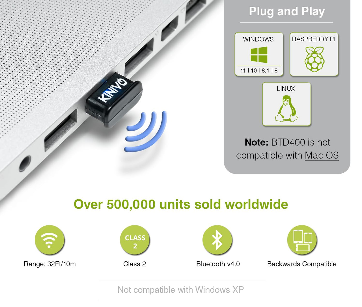 The Kinivo Btd-400 Bluetooth Usb Adapter Lets You Communicate Wirelessly With Bluetooth Devices Such As Cell Phones, Pdas, Mice, Keyboards Etc Highly Portable Btd-400 Is Highly Portable Due To Its Petite Dimensions It Seamlessly Gets Plugged Into A Computerlaptop Without Blocking Surrounding Usb Ports Compatibility And Specifications - Btd-400 Transforms Any Computer With A Usb Port To A Bluetooth Enabled Computer - Built With The Latest Bluetooth Specification V40 Class 2 - Supports All Common Bluetooth (Wireless) Peripherals - Keyboards, Mice, Headsets, Stereo Headphones, Etc - Backwards Compatible With Bluetooth Versions 212030 - Compatible With Windows 10 81 8 Windows 7 Vista Xpa - Not Compatible With Mac Os - Consumes Very Low Power From The Host Pc Note: For Windows 10, Please Use Windows Drivers Instead Of Broadcom Drivers Easy To Use Instructions Are Available On Kinivo Support Website Note: Windows 8 And Windows 81 Automatically Finds And Installs The Latest Drivers When The Btd-400 Dongle Is Plugged In For The First Time Windows 7 Vista Xp Users Need To Use The Included Cd (Or Online Links) To Install The Drivers Whats In The Box - Kinivo Btd-400 Bluetooth Usb Adapter - Installation Cd For Windows 7Vistaxp (Not Needed For Windows 10 81 8) - User Manual Kinivowarranty Kinivo Btd-400 Usb Bluetooth Adapter Is Backed By Our 2 Year Limited Hardware Kinivowarranty Please Contact Us If You Have Any Questions