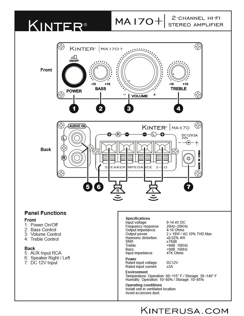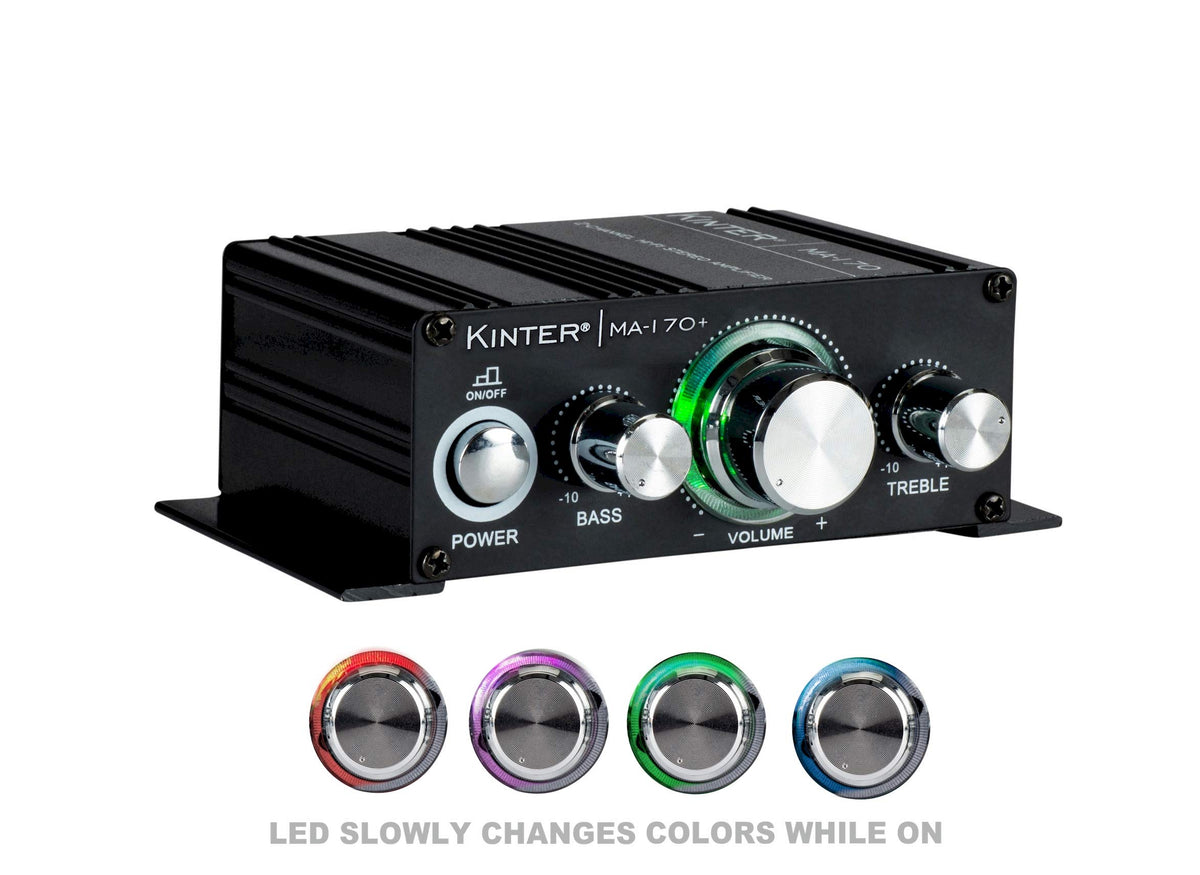 Note: This Unit Includes A 12V 3Amp Power Supply. Kinter'S Ma-170 Mini Amplifier Is The New Value Leader In Audio Amplifiers, With 18 Watts Of Robust Power Per Channel And A Stylish, Modern Appearance. The Latest In Ic-Based Amplifier Technology Delivers Smooth, Natural Sound Without Fatigue Or Distortion, While Running Cool And Drawing Minimal Power. The Kinter Ma-170 Is The Real Deal! You Can Use The Ma-170 In A 2-Channel Home Audio System, Or Build Its Capability Into A Portable Unit That Can Be Taken Anywhere. Rca Inputs And Convenient Spring Terminal Outputs Will Work With Virtually Any Source And Speakers To Create A Great Sounding Audio System. The Black Anodized Aluminum Housing'S Integrated Mounting Tabs Make It Easy To Mount The Amp Anywhere. The Glowing Leds Really Set The Mood For Any Music Genre.Specifications: Power Output: 2 X 18 Watts Input Impedance: 47K Ohms Output Impedance: 4 - 16 Ohms Frequency Response: 20 - 20,000 Hz Minimum Thd: =0.02% Input Voltage: 9 - 14.4 Vdc Rated Input Current: 1A - 3A Dc Plug Size: 2.1 Mm X 5.5 Mm Dc Input Polarity: Center Positive 12V 3A Power Supply Included Dimensions: 4-7/8' L X 1-5/8' W X 4-5/8' D.