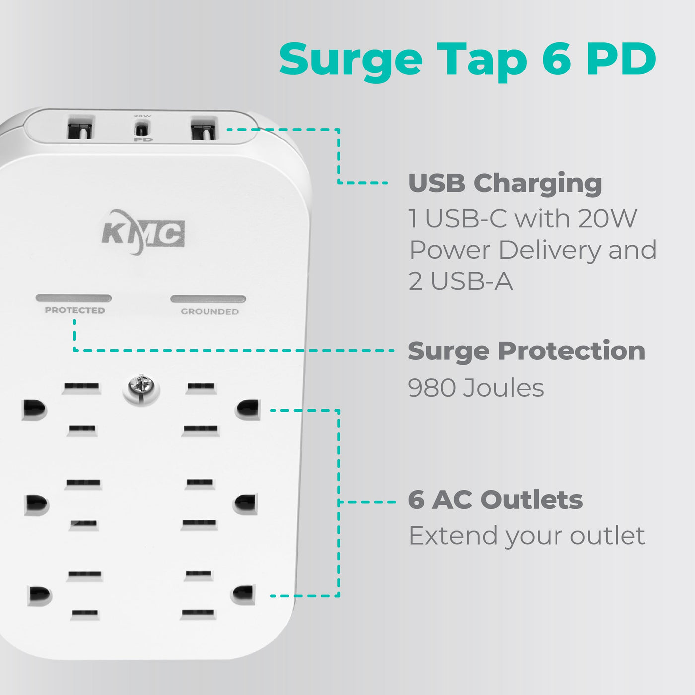 Kmc 6 Outlet Extender Usb C Pd Surge Protector Wall Tap, Multi Plug Usb Wall Charger, 2 Usb A Ports & Usb C 20W Power Delivery, High Speed Phone Charger, 980J Surge Protection, Ul/Etl Certified, White