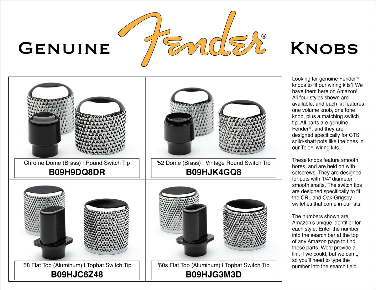 Genuine Fender Knob Set, With Genuine Fender Switch Tip. Knobs Fit Cts Pots With 1/4'' Solid Shafts. Switch Tip Fits Crl Or Oak-Grigsby Switches. Fits Nearly All Usa And Mexico Fender Tele-Style Instruments Made Since 1950. The Knobs Are Chrome-Plated Brass, Held On With Setscrews. The Tops Are Mirror Finish. Fits Our Toneshaper Wiring Kits. Knobs May Be Used On Imported Pots With Metric (6Mm) Shafts, But Won'T Fit Like They'Re Supposed To. These Knobs Have A 1/4'' Hole (6.35Mm) - When Installed On 6Mm Shafts, They'Ll ''Wobble'' When Turned. The Switch Tip Is Designed For The Original Crl Switches That Fender Began Using In The 1950S, And Also Fits The Oak-Grigsby Lever Switches That Fender Began Using Several Decades Later, And That They Still Use Today. It Will Likely Not Fit Imported Switches Very Well Unless Their Levers Measure Roughly 3/16'' Wide (.188'' Or 4.76Mm), And .050'' Thick (1.27Mm).