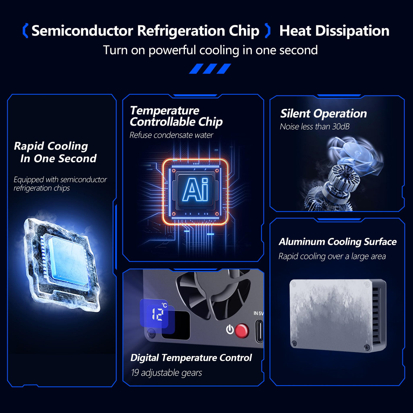 Specifications: Product Name:Camera Cooling Fan (Digital Temperature Controlled Version) Color Optional: Black Applicable Voltage: Type-C 5V/2A Input Fan Speed: 5000Rpm Noise Figure: =26Db Material: Aluminum Alloy + Pc Size And Weight: 70*50*21Mm/110G Power Cord Length: 2 Meters