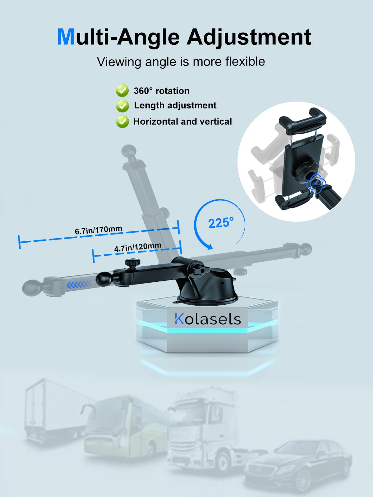 Kolasels Car Dashboard Windshield Tablet Mount For 4 13' Ipad & Phone, Telescopic Arm Suction Cup Truck Dash Window Tablet Holder For Ipad Pro 12.9 11 10.5 9.7, Ipad Air Mini, Samsung Tabs, Iphone Etc