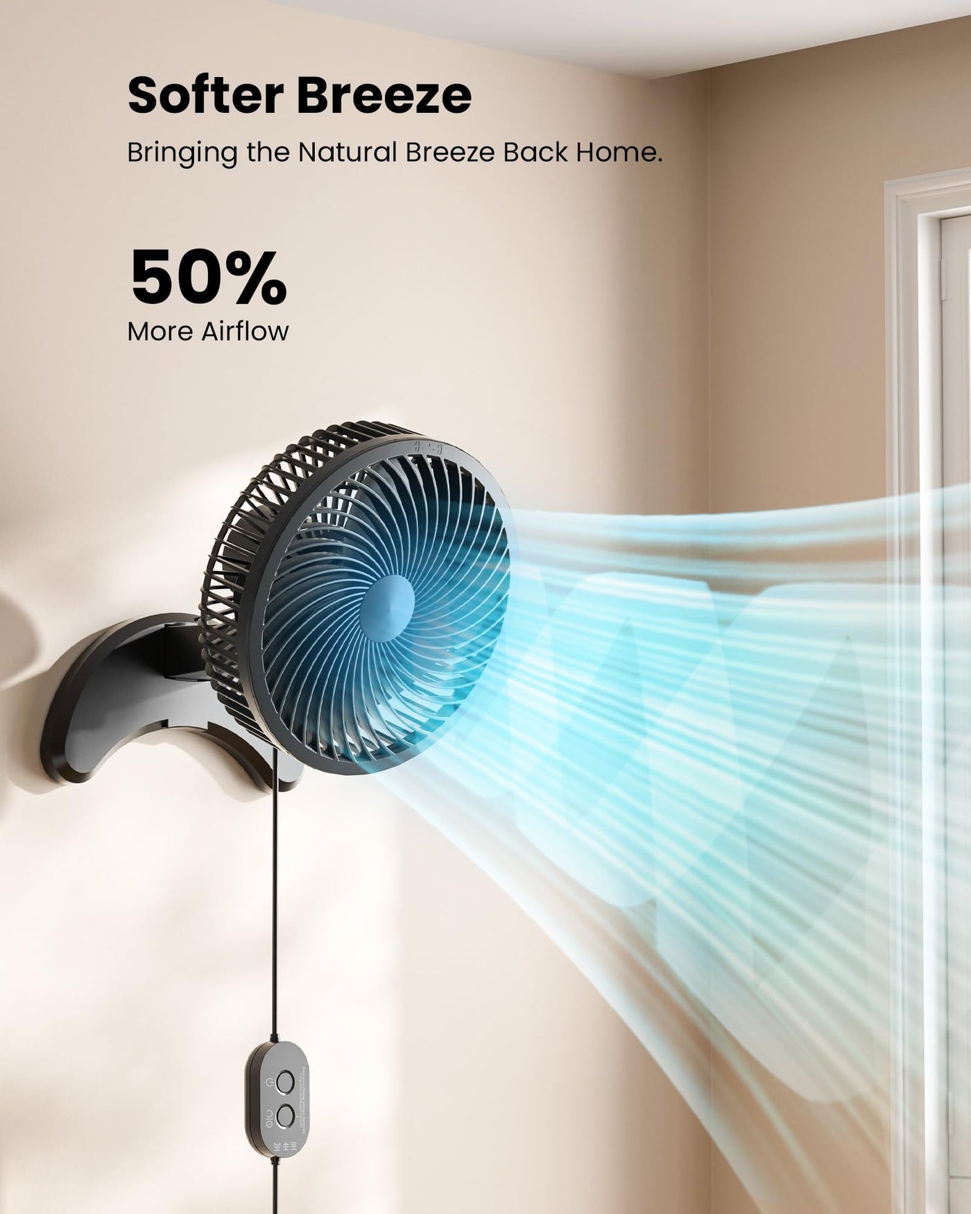 Q: What timer settings are available for the Koonie wall fan?A: The fan features three timer settings of 2, 4, and 8 hours, allowing you to schedule the cooling according to your needs for added convenience.