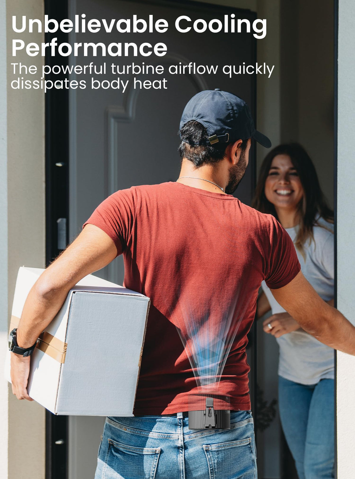 Q: Can I wear the Koonie Waist Fan under my clothing?A: Yes, the Koonie Waist Fan is designed to be worn under clothing with its clip-on feature. This allows for discreet cooling while you work or engage in activities, ensuring you stay comfortable without compromising your style.
