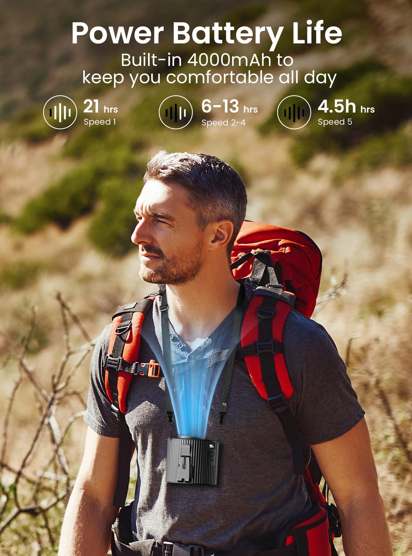 Q: How long does the battery last on the Koonie Waist Fan?A: The Koonie Waist Fan is equipped with a large capacity battery that can last between 4 to 21 hours, depending on the selected wind speed. The lowest speed can provide up to 21 hours of cooling, making it perfect for all-day use.
