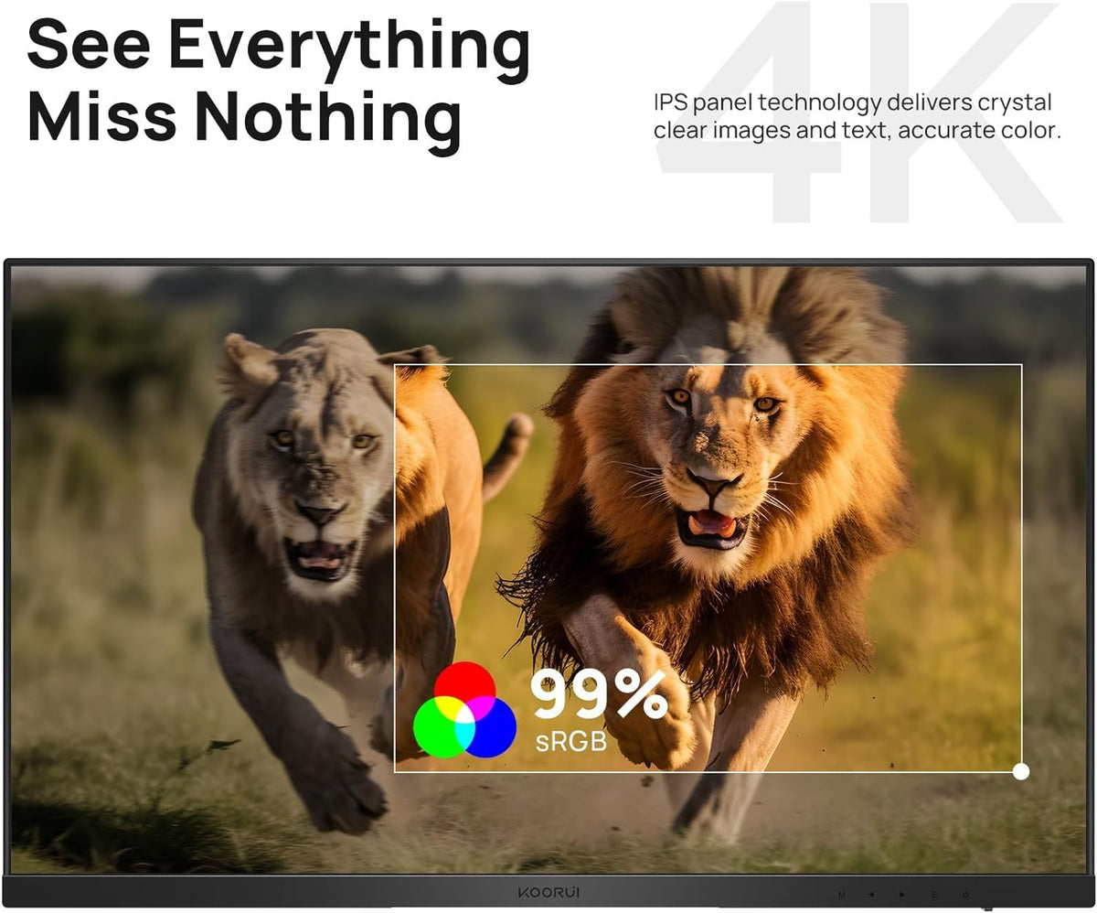 Q: What are the main features of the KOORUI 27 Inch 4K Monitor?A: The KOORUI 27 Inch 4K Monitor features a UHD resolution of 3840 x 2160, 99% sRGB and 90% DCI-P3 color gamut coverage, delivering vibrant colors and dynamic visuals. It has a 60Hz refresh rate, IPS display for wide viewing angles, and supports VESA mounting for ergonomic setups.