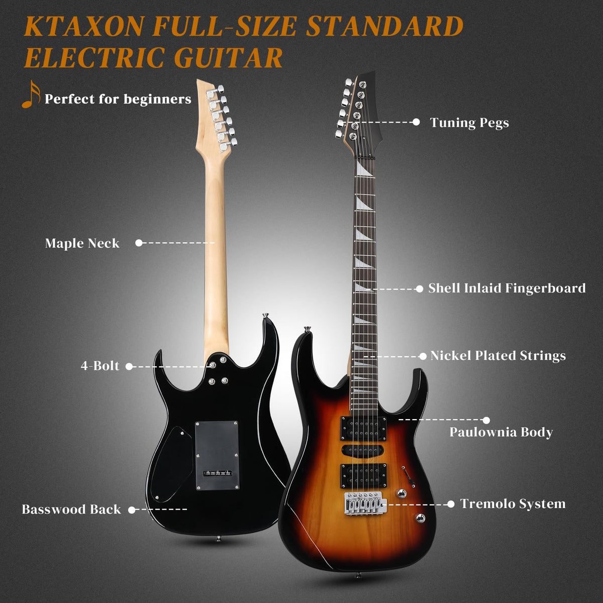 Ktaxon 39 Electric Guitar With 20Watt Amp, Full Size 170 Model Starter Guitar Kit Specifications: 1 Style: Electric Guitar 2 Brand: Ktaxon Body 1 Orientation: Right Handed 2 Body: Basswood 3 Color: Brown Sunburst Neck And Fingerboard 1 Neck: Maple 2 Fingerboard: Rosewood 3 Strings: 6 4 Frets: 24 5 Nut Width: 1656 In (42 Mm) 6Scale Length: 255 Pickups & Hardware 1Pickups: Humburcer-Single-Humbucker 2Control: 5 Way Switch 1 X Volume 1 X Tone 3 Hardware: Tremolo 4 Jack: 14 20W Electric Guitar Amp 1 Front Panel Controls: Gain, Bass, Treble, Volume, Headphone 2 Bass Guitar Input: (14 Jack) 3 Headphone Output: (14 Jack, Speaker Defeating) 4Dimensions: 29*27*113Cm 5Weight: 30 Kg 6 Speaker Size: 85 Inch 7 Impedance: 4O 8 Auxiliary Input Jack(Mp3): 18 Inch Dimensions 1Guitar: 386L X 128W X 165H 2 Guitar Weight: 628Lb Package Includes: 1 X Electric Guitar 1 X 20W Electric Guitar Amp 1 X Electric Guitar Bag 1 X Guitar Strap 1 X Tremolo Arm 1 X Amp Wire 1 X Wrench Tool 1 X Plectrum