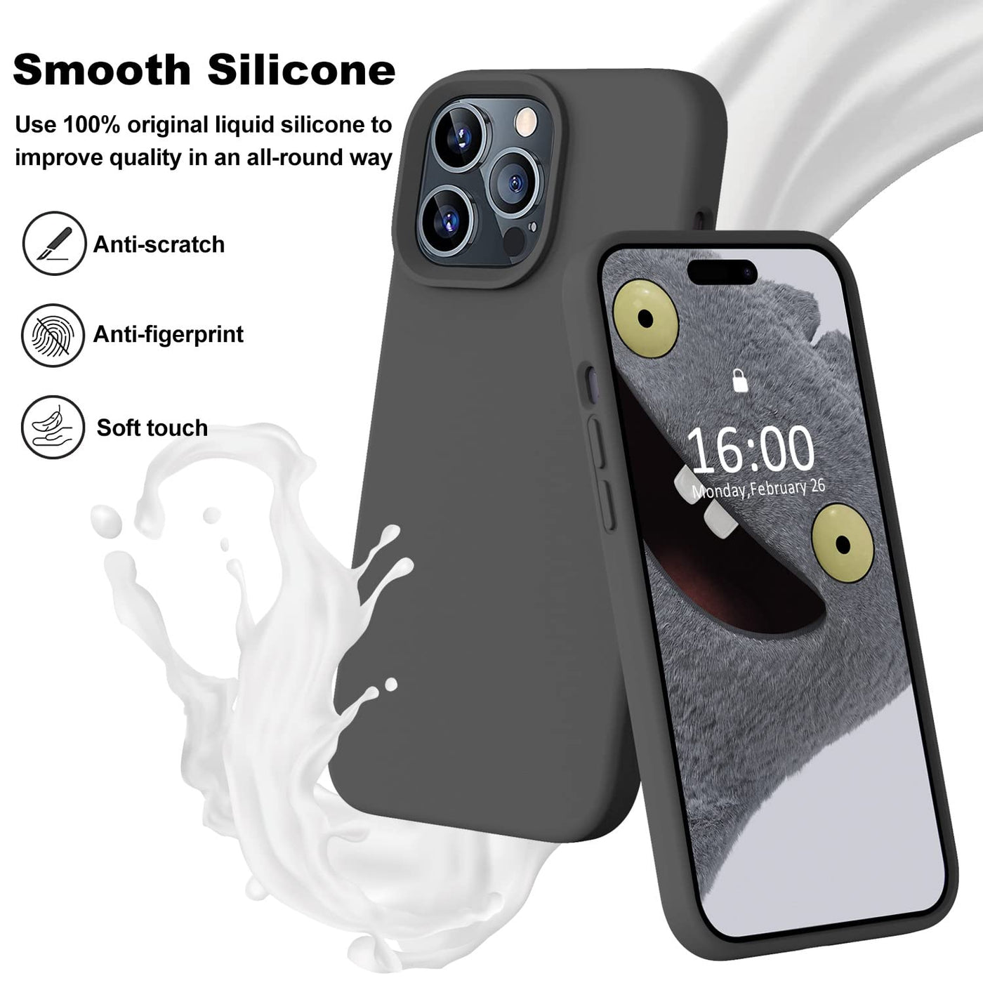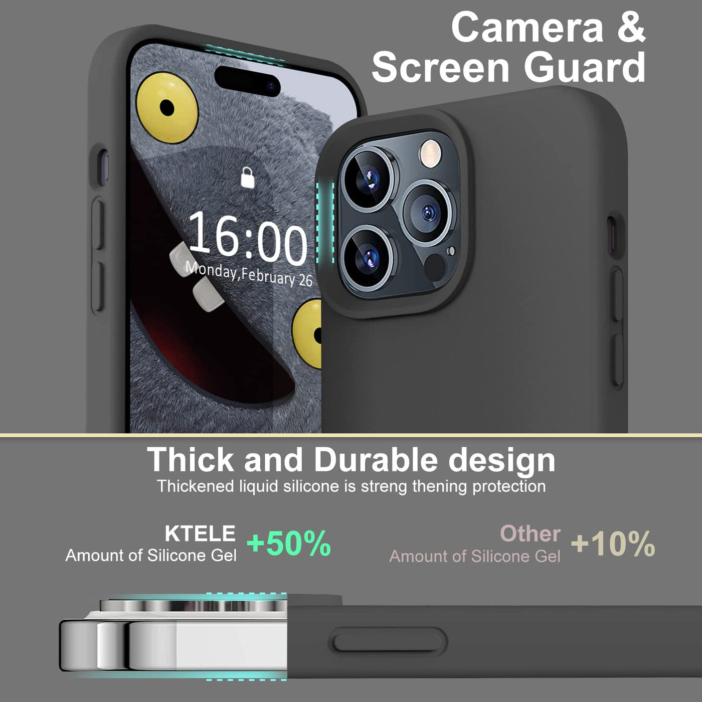 Q: What materials are used in the Ktele iPhone 14 Pro Max case?A: The Ktele case is made from premium thickened liquid silicone which provides a soft, warm feel and features a fine oleophobic layer for better dust resistance.