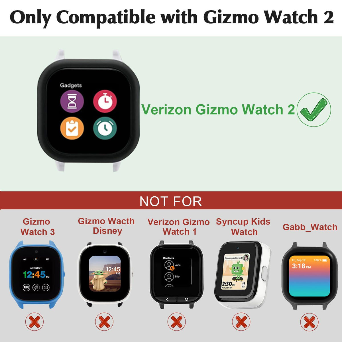 Compatible With: Ot For Gizmo Watch 1, Gabb Watch, Syncup Kids Watch And Disney_Editions Watchthis Gizmo 2 Watch Screen Protector Case Only Compatible With Verizon Gizmo Watch 2 2 In 1 Design: Made Of Hard Pc And Tempered Glass Screen Protector 2 In 1 Design, Protects Your Gizmo Watch From Scratch, Bumps, And Accidental Drops Easy Installation & Charging Directly: Easy To Install And Take Off The Gizmo Screen Protector Case Allows Full Access To Touchscreen, Buttons, And Ports Dont Need To Take Off The Watch Case When Charging Sensitive Touch: Use The Material Of Ultra-Thin Tempered Glass Film, Which Keeps The Watchs Original Response Sensitivity, Ensuring Quick App Launching Service: Our Gizmo 2 Screen Protector Are Under 360 Days Warranty Package Contents: Cleaning Pads *1, Gizmo Watch 2 Screen Protector *1 Cases Only For Gizmo Watch 2