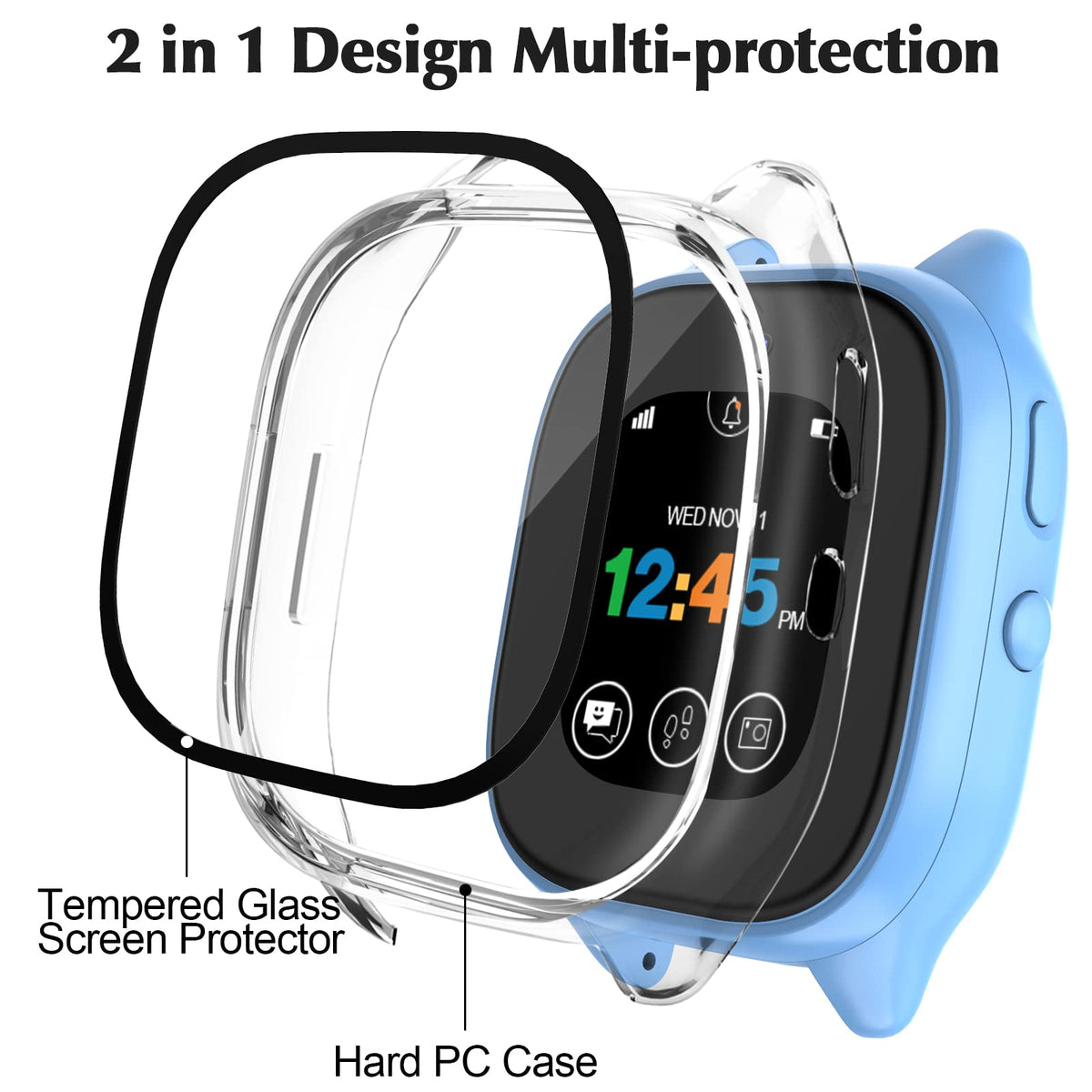 Q: How does the 2 in 1 design of this screen protector benefit my watch?A: The 2 in 1 design combines a hard PC case with a tempered glass screen protector, providing comprehensive protection against scratches, bumps, and accidental drops, ensuring your watch remains safe and intact.