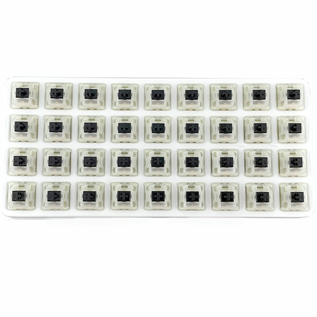 Q: What material is used in the construction of the switches?A: The switches are made of plastic, ensuring durability and a lightweight design. The milky clear housing enhances RGB effects.