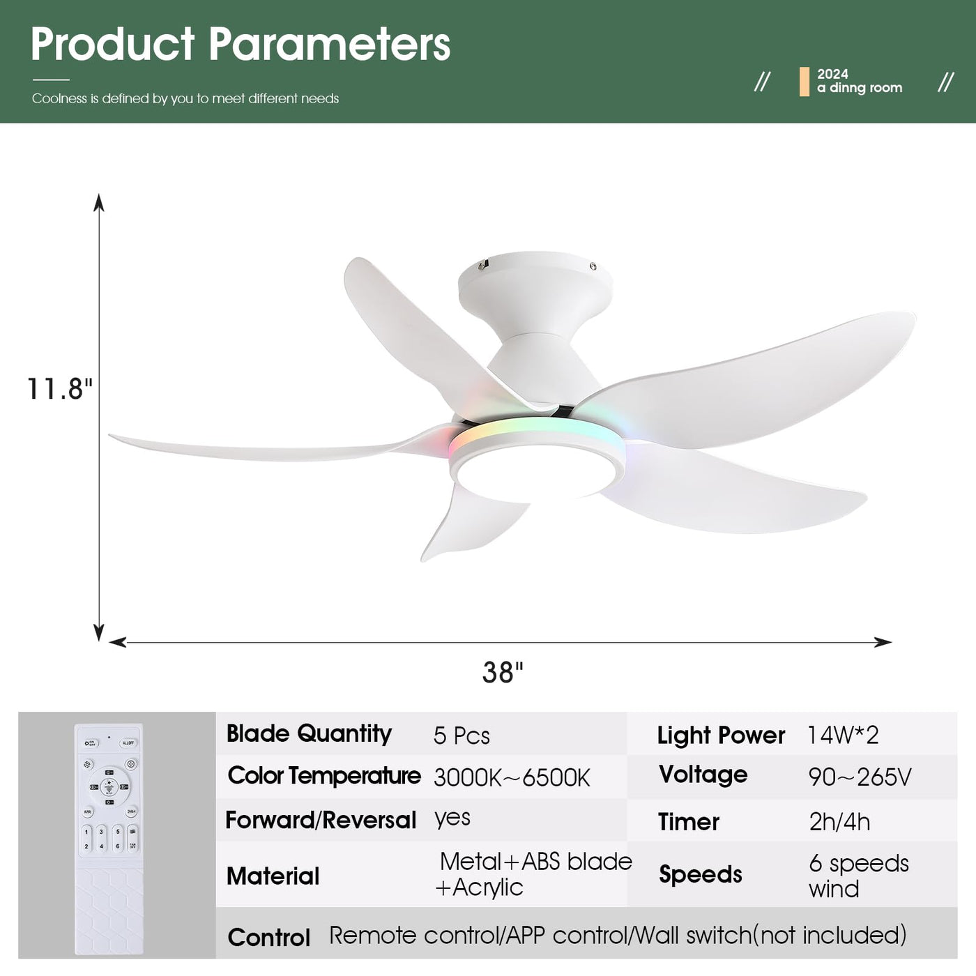 Independent Rgb Ring Light: This Simple Styling 5-Blade Fan Light Fan Blade Unfolding Diameter Has 38 Inches, The Light Is Divided Into 3-Color White Light And The Side Of The Rgb Aperture, You Can Use The Remote Control Or Cell Phone App To Independently Control The 2 Kinds Of Light; Widely Adapted To The Needs Of Various Occasions, Such As Bedroom, Dining Room, Living Room, Bar, Game Room, Etc., Very Unique. | Reversible Dc Motors: By Pressing The F/R Key On The Remote Control, You Can Switch The Wind Direction Of The Ceiling Fan From The Downdraft In Summer To The Updraft In Winter, Thus Recovering The Heat Lost By The Ceiling And Distributing The Heat Evenly Throughout The Room; Compared With Traditional Ac Motors, It Is More Energy Efficient, More Silent, And The Noise Level Is Less Than 30 Db. It Is More Suitable For Families With Babies Or Elders. | Remote & App Control: Remote Control Features Include 6 Speed Speed, 3 Color Temperature And Endless Dimming, Night Light Mode, 2/4-Hour Timing Off (Only Fan), Separate Off Lights Or Fans And So On. You Can Also Scan The Qr Code On The Manual, Download The App And Pair It To Control The Fan Light From Your Phone. Easily Adapt To Any Scene Needs, The Perfect Replacement For Traditional Fans Or Chandeliers. (Remote Control Can Be Installed On The Wall As A Wall Switch) | High Quality: This Ceiling Fan Is Made Of High-Quality Abs Material And Metal, Which Is Strong And Durable. The Fan Motor Adopts Pure Copper Motor, Which Has The Characteristics Of Strong Power And Low Noise. | Easy Installation: The Installation Of This Ceiling Fan Is Very Simple, And We Have Detailed Installation Instruction And Installation Video, Providing Users With A Cost-Effective Installation Method, With Safety Hook Included In The Box, It Can Be Easily Installed By Just One Person. If You Have Any Problems, Please Contact Us. We Provide 24-Hour Technical Support.