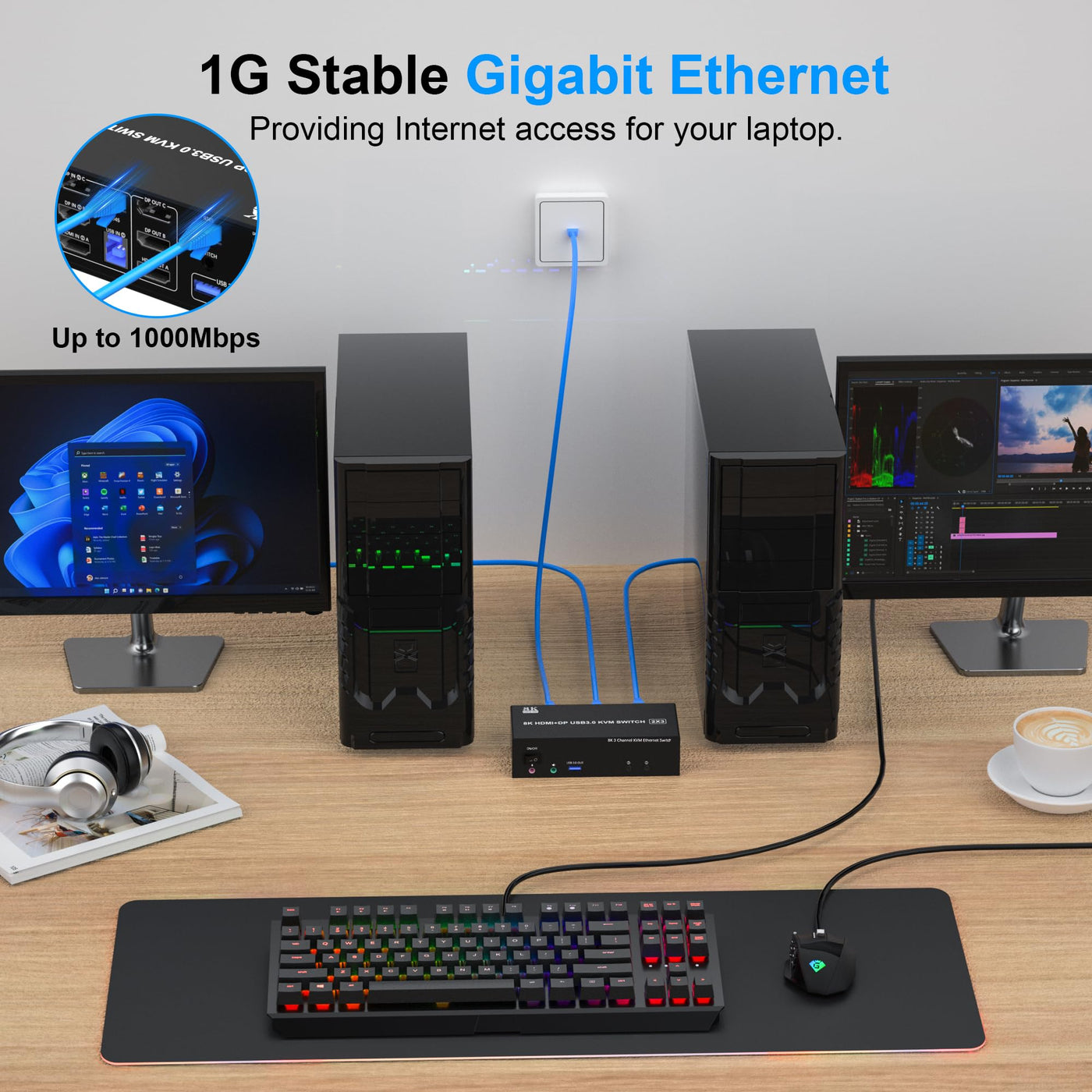 8K@60Hz 4K@144Hz Kvm Switch 3 Monitors 2 Computers Sharing 3 Monitor, 3 Usb 3.0 Ports, Audio &Amp; Microphone, 1000Mbps Lan Ethernet &Nbsp; Features &Nbsp; 1. 8K Triple Monitor Kvm Switch Allows 2 Computers/Laptops To Share One Set Of Keyboard, Mouse, And 3 Monitors (2 Hdmi+1 Displayport) &Nbsp; 2. Support Hdmi 2.1&Amp; Dp 1.4 Standards And Downward Compatibility. 3 Monitors Output Support Up To 8K@60Hz 4K@144Hz For Extended, Mirrored Or Spliced Display(Depends On Your Computer'S Graphics Card.) &Nbsp; 3. 2 Switching Modes: Button Switch And Wired Remote. &Nbsp; 4. This Triple Monitor Kvm Switch Share 1000Mbps Gigabit Ethernet Between 2 Computers, Providing Internet Access For Your Laptop. &Nbsp; 5. 3 Monitor Kvm Switch Equipped With 3 Usb 3.0 Ports For Usb Devices, And With Extra Audio Microphone Output &Nbsp; 6. Equipped With A 12V Power Supply, Ensuring Stable Operation Even When High-Power Devices Are Connected. &Nbsp; 7. Plug And Play, Compatible With Windows, Linux, Mac, Unix, Ubuntu, Raspberry And Most Other Major Os. &Nbsp; 8. The Ports That Need To Plug In Hdmi/Displayport/Usb Cables Are All Hidden Behind The Triple Monitor Kvm Switch, So The Desktop Doesn'T Get Cluttered, You Can Enjoy The Clean Workspace. &Nbsp; Ultra Hd 8K@60Hz Triple Monitor Kvm Switch Confirms To Hdmi 2.1 &Amp; Dp 1.4 Protocol, Supports A Maximum Resolution Of 8K@60Hz 4K@144Hz, And Is Compatible Downwards. Only When Both Your Computer Graphics Card, Monitor And Cable Support 8K@60Hz Then You Can Get 8K@60Hz Effect, So If You Want The Max Resolution You Have To Check Your Devices First. &Nbsp; 3 Display Modes Extended Display &Nbsp; Mirrored Display &Nbsp; Spliced Display &Nbsp; 1)Extended Mode Can Output Three Different Screens And Mirror Mode Can Output Three Identical Screens. Note:If Your Graphics Card Has A Splicing Screen Function, You Can Use The Splicing Screen Mode. &Nbsp; 2) The Requirement For This Kvm To Achieve A Triple-Screen Display Is That Each Pc You Connect To Has The Capability To Support A Triple-Screen Display. This Has Nothing To Do With Kvm. &Nbsp; Installation Steps: 1. Insert The Dc/12V Adapter Into The Kvm ; &Nbsp; 2. Plug The Ethernet Rj45 Cable Into The Kvm Switch; &Nbsp; 3. Plug The 2*Hdmi Cable And 1*Displayport Cable Into The Kvm Switch And Monitor;(Hdmi Out A, Hdmi Out B, Dp Out C) &Nbsp; 4. Plug The Displayport Cable, Hdmi Cable, Rj45&Nbsp;Cable,&Nbsp;And Usb Cable Into The Kvm Switch And Your Computer/Laptop (Hdmi And Dp Cables Are Not Included)(Input) &Nbsp; Hdmi In 1A +Hdmi In 1B + Dp In 1C + Rj45 + Usb In 1=Pc1 &Nbsp; Hdmi In 2A + Hdmi In 2B + Dp In 2C + Rj45 +&Nbsp;Usb In 2=Pc2 &Nbsp; Please Check Whether Hdmi In 1A, Hdmi In 1B, Dp In 1C, Rj45, And Usb In 1 Corresponding, And Whether Hdmi In 2A, Hdmi In 2B, Dp In 2C, Rj45&Nbsp;And Usb In 2 Are Corresponding. Mixed Insertion Is Not Supported. &Nbsp; 5. Insert The Mouse And Keyboard Into The Kvm Switch &Nbsp; 6. If Needed, You Can Connect A Microphone And Audio Port &Nbsp; Note: &Nbsp; 1. Most Of The Reasons Why Only One Video Output Works Is Because Of Incorrect Connection. Please Make Sure Each Pc Has(2 Hdmi +1 Dp+Usb Cable) Connect To The Kvm. &Nbsp; 2. If The Input Usb3.0 Ports Are Not Connected Or Connected Incorrectly, The Output Usb Device Will Not Be Recognized. &Nbsp; 3.&Nbsp;Note: Hdmi, Dp And Ethernet Cables Are Not Included &Nbsp; Switch By Panel Button Push-Button Design Allows For One-Touch Switching Using A Button On The Kvm Switch Box, Eliminating The Need To Plug And Unplug Cables Frequently, Saving Space And Time. &Nbsp; Wired Remote Control Supports Wired Remote Switching For Easy Cable Management, You Can Switch Directly On The Desktop, Convenient For Your Life And Work &Nbsp; Led Indicator When Switching To Which Pc, The Led Will Tell You Whether Pc1 Or Pc2 Is Active. &Nbsp; Audio And Microphone Output 3 Monitors 2 Computers Kvm Comes With A 3.5Mm Audio Jack Port With A Dac Chip Inside, Which Can Be Inserted Into A 3-Segment 3.5Mm Earpiece Device, And A 3.5Mm Microphone Interface, Which Can Be Inserted Into A 3-Segment Microphone
