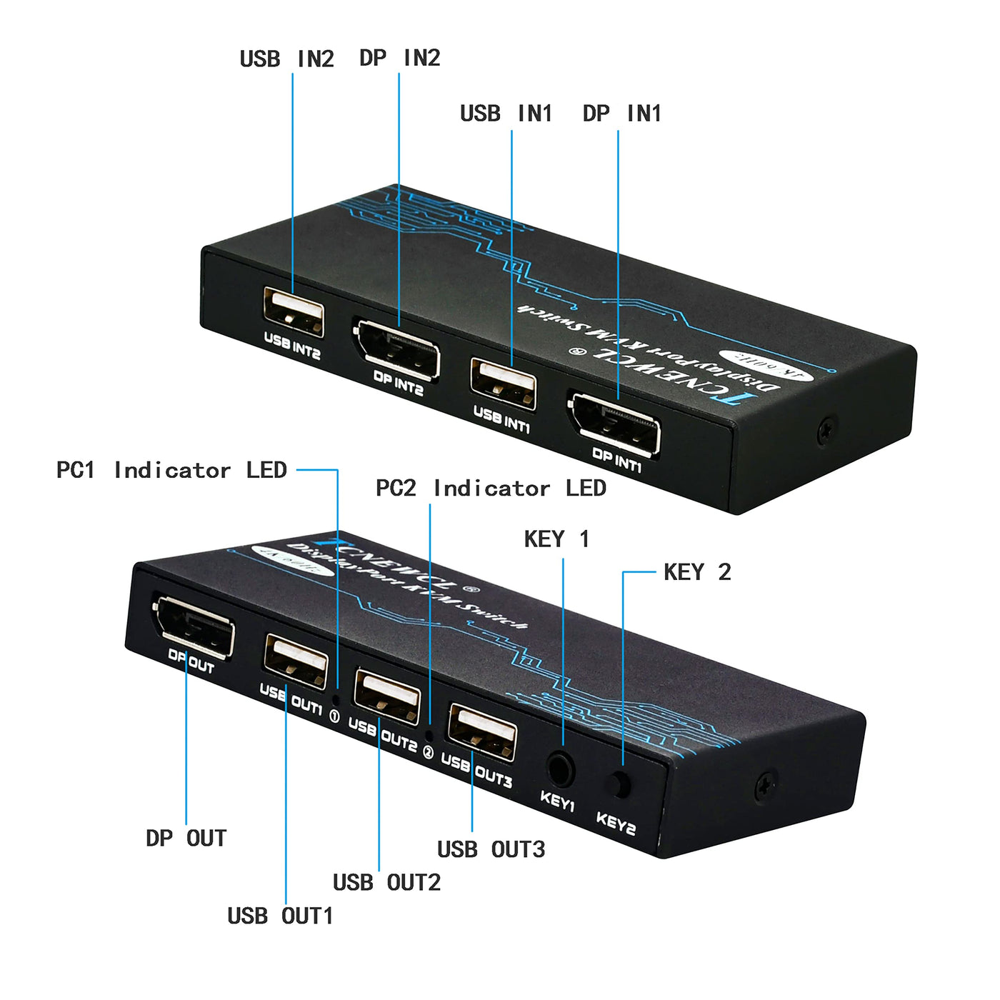 • Q: What resolutions does the TCNEWCL DisplayPort KVM switch support? A: The TCNEWCL DisplayPort KVM switch supports resolutions up to 4K at 60Hz (3840x2160) and is backward compatible with lower resolutions like 1080P and 720P, making it suitable for high-definition displays.