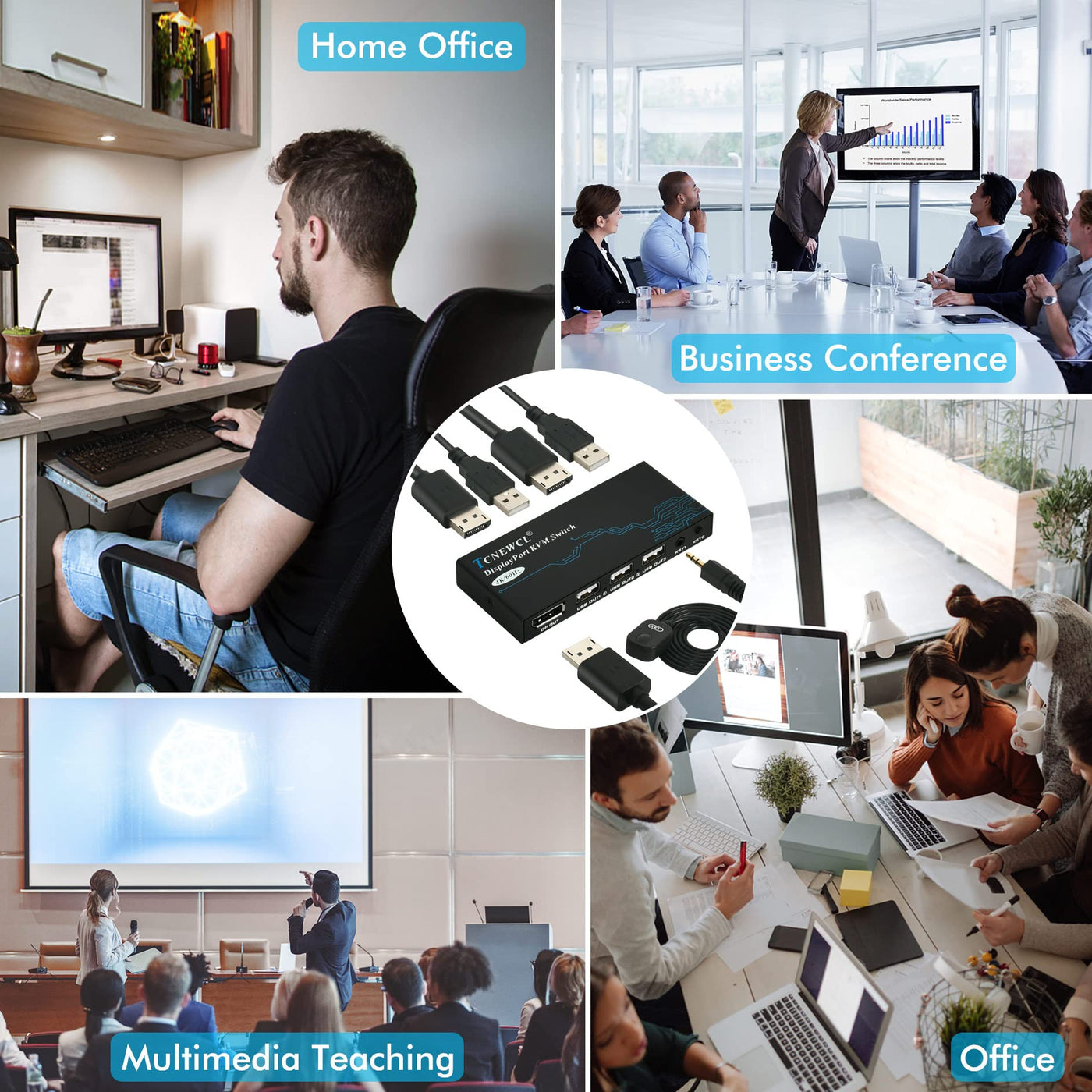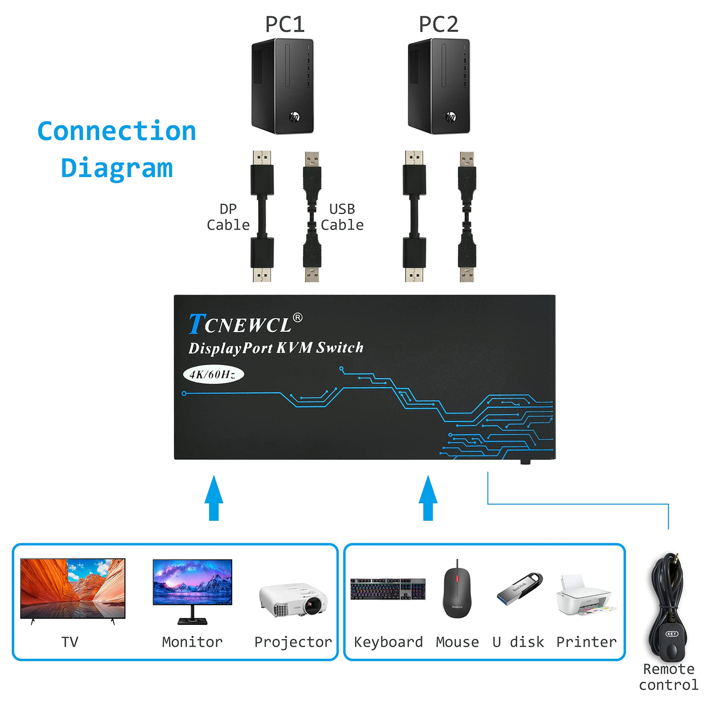 • Q: What comes included in the package with the KVM switch? A: The package includes the TCNEWCL DisplayPort KVM switch, two DisplayPort cables, two USB cables, a wired desktop controller, and a user manual, allowing you to set up everything without needing additional cables.